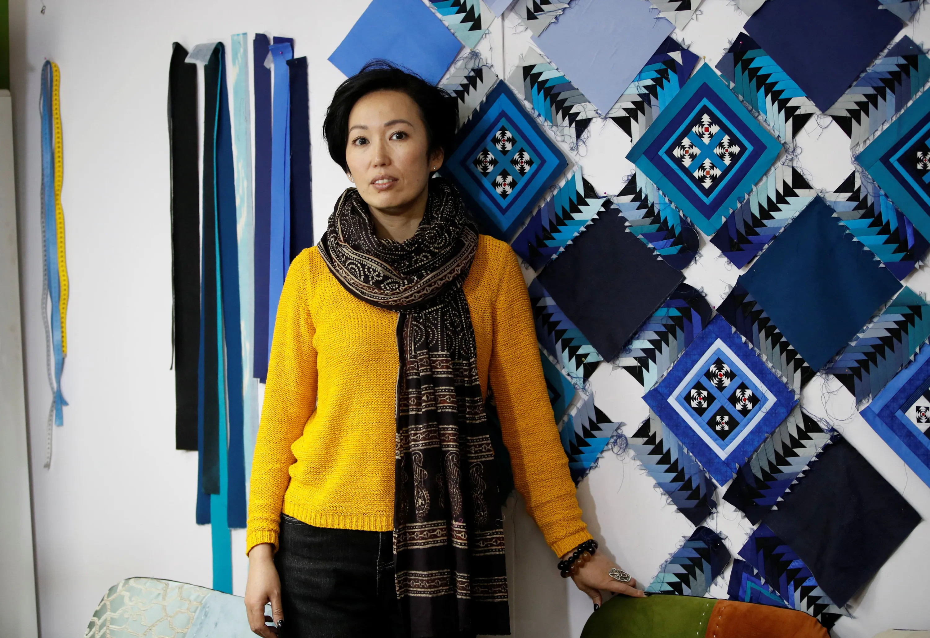 Kyrgyz artist and environmental activist Cholpon Alamanova poses for a picture in her workshop in Bishkek, Kyrgyzstan on March 30, 2023. Alamanova and her team of more than 80 women use the Kyrgyz traditional patchwork sewing technique, kurak, in order to recycle the textile waste, usually burned in landfills, into colourful blankets, clothes and accessories. (Photo by Pavel Mikheyev/Reuters)
