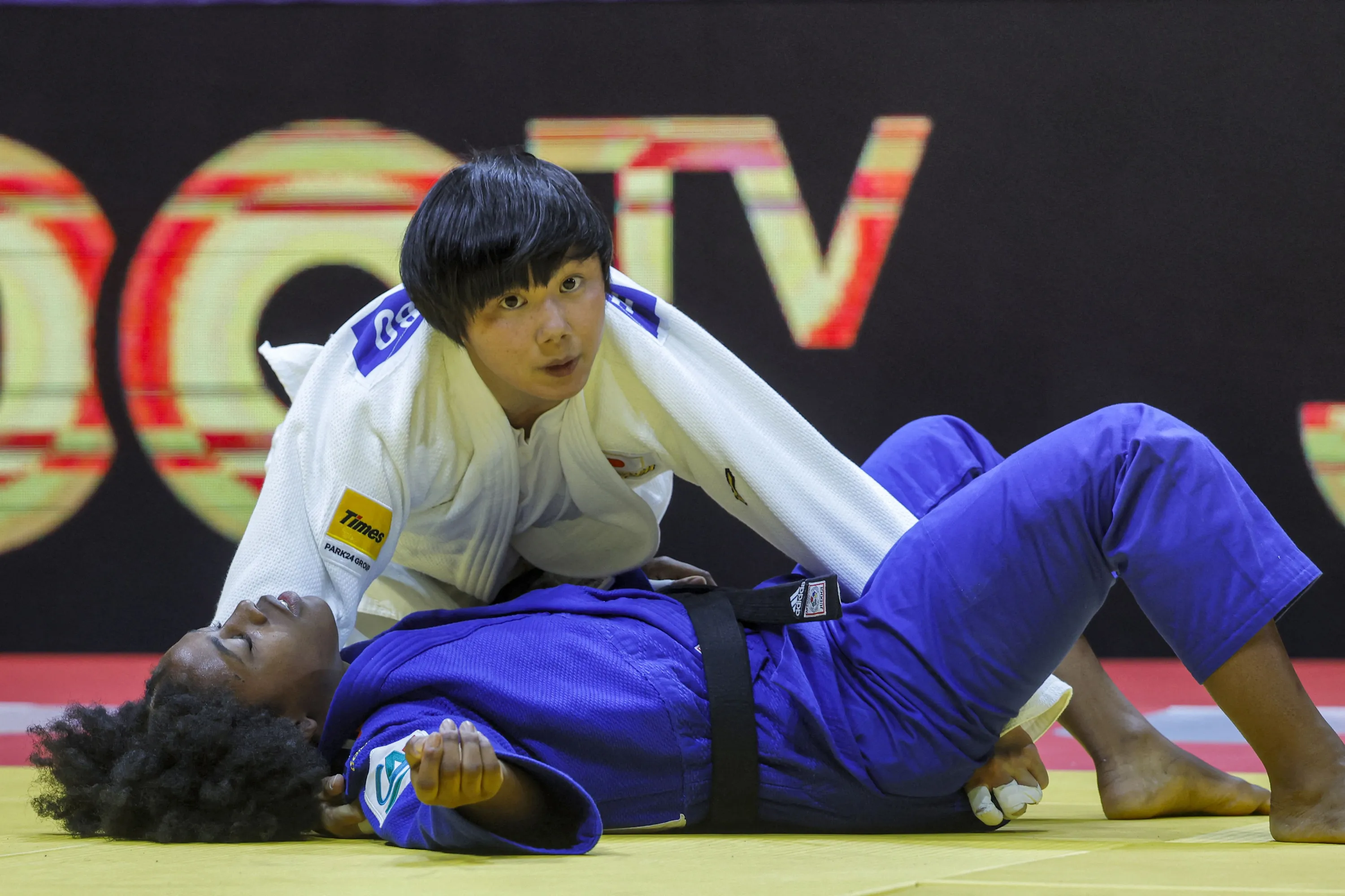 Japan's Haruka Funakubu (white) competes against France's Sarah-Leonie Cysique during the teams mixed final bout at the World Judo Championship in Doha on May 14, 2023. (Photo by Karim Jaafar/AFP Photo)