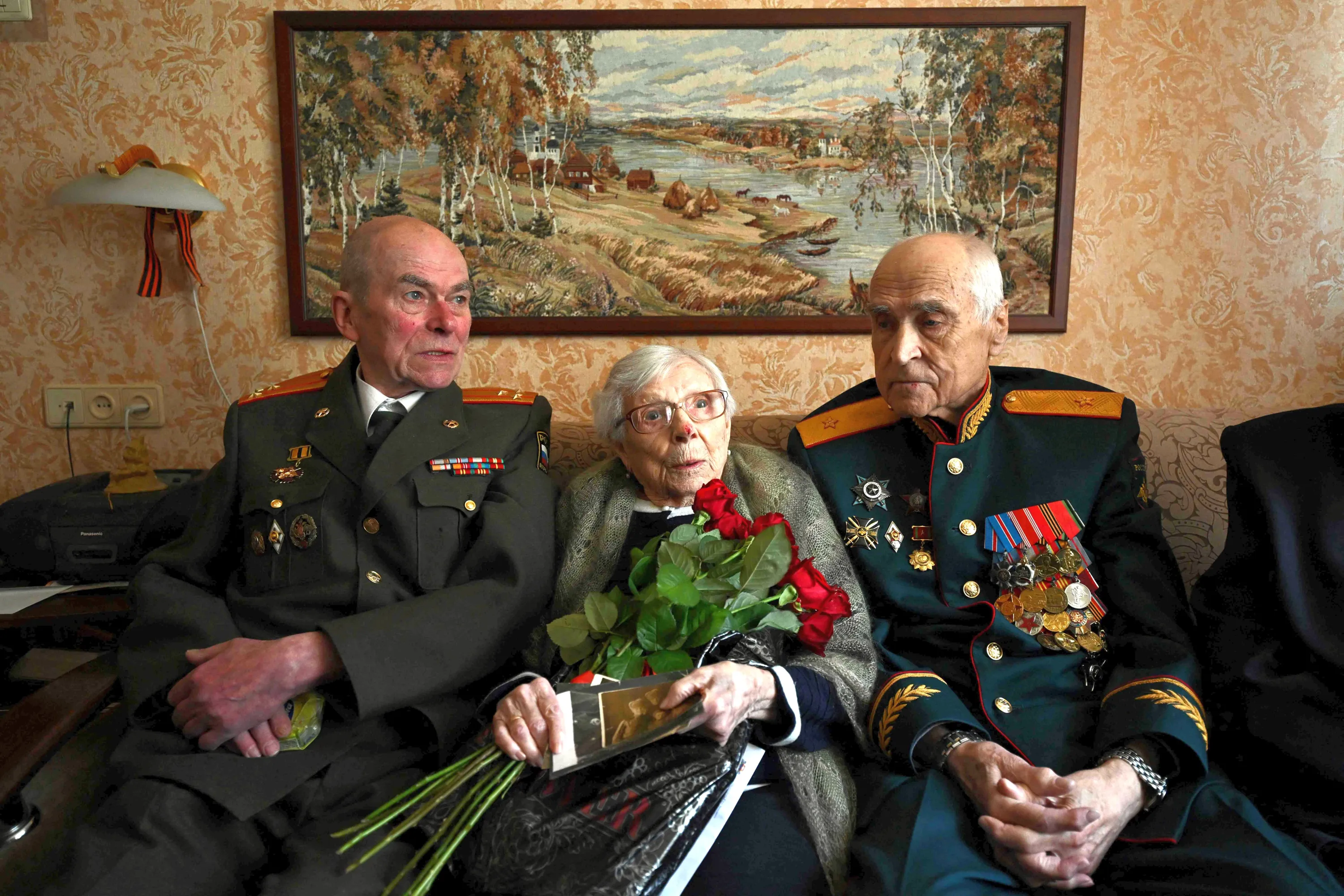 World War Two veteran, anti-aircraft gunner Valentina Goryacheva, 99, is congratulated by members of a local veterans council upon the upcoming Victory Day in Moscow, on May 2, 2023. Cheerful Moscow veterans dance, share toasts with comrades and sing patriotic songs at events leading up to Victory Day. On May 9, Russia will celebrate the 78th anniversary of the Soviet victory against the Nazis in 1945. The last heroes on the Great Patriotic War remain strong and optimistic, proudly looking back at their lives and personal feats. (Photo by Natalia Kolesnikova/AFP Photo)