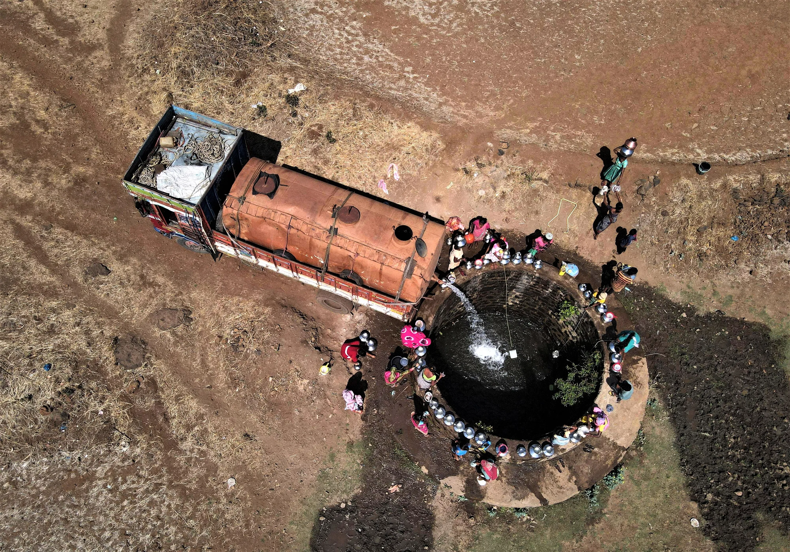 A drone view of a tanker emptying water into a well as women draw water from it in Telamwadi near Mumbai, India on May 17, 2023. (Photo by Francis Mascarenhas/Reuters)