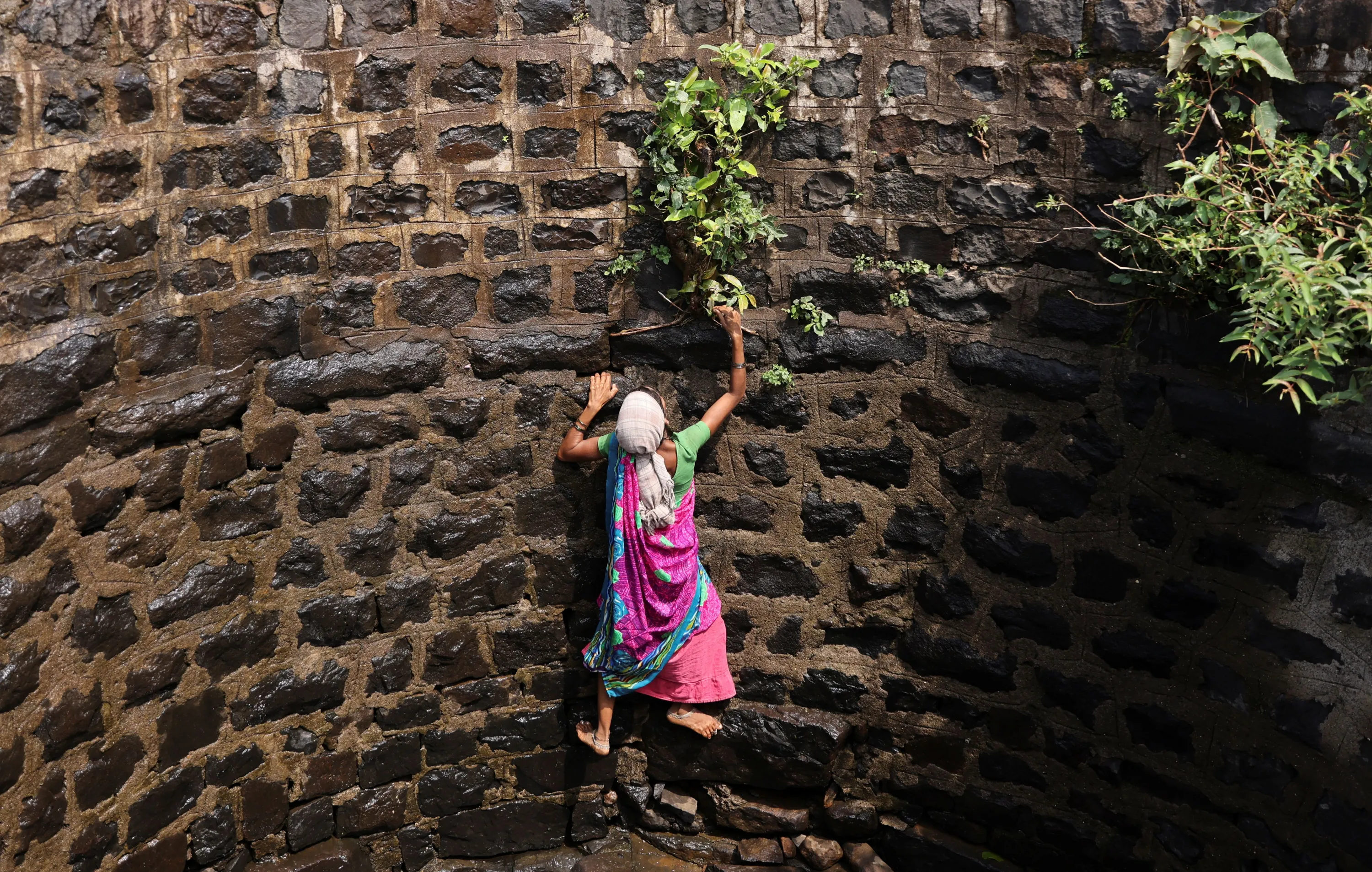 Suman Bhutambare attempts to climb out of a well after climbing in to retrieve a friend's sieve that fell inside, in Telamwadi near Mumbai, India on May 16, 2023. (Photo by Francis Mascarenhas/Reuters)