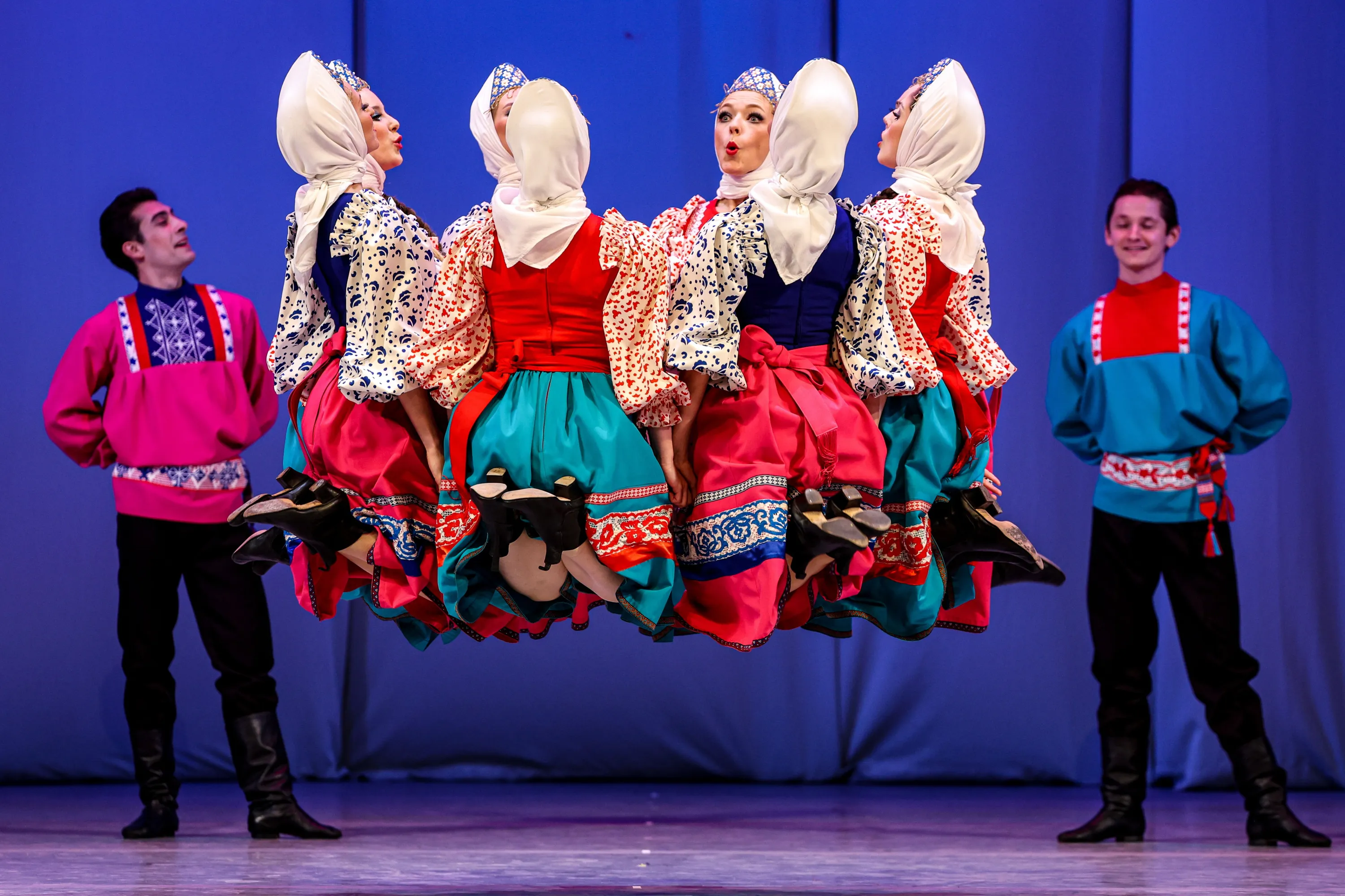 Members of the Berezka State Academic Choreographic Ensemble perform during a concert to mark its 75th birthday at the Tchaikovsky Concert Hall in Moscow, Russia on May 15, 2023. (Photo by Sergei Bobylev/TASS)