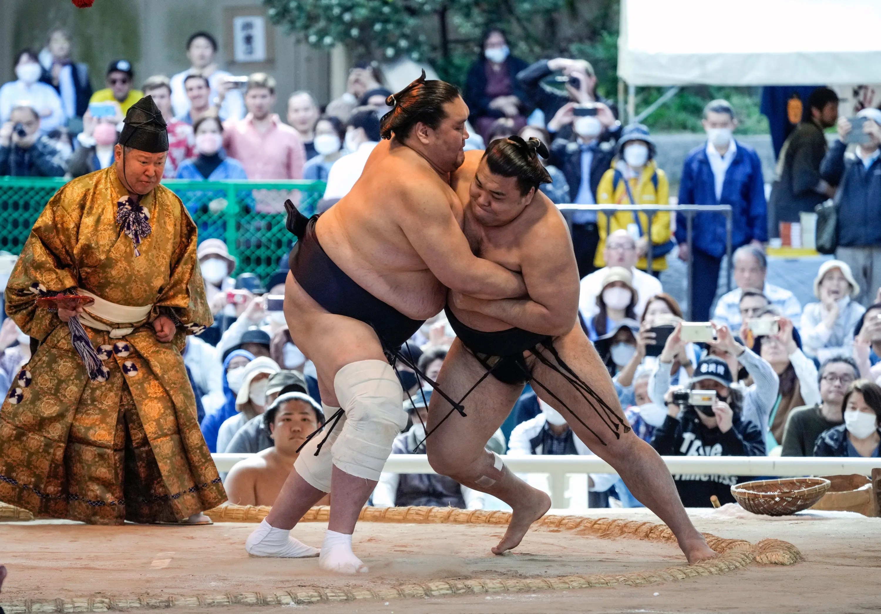 Grand Champion Haruo Terunofuji (C), Mongolian-born Japanese sumo wrestler, fights with Mongolian sumo wrestler Tetsuo Kiribayama during a final bout of the annual dedicated grand sumo tournament “Honozumo” at Yasukuni Shrine in Tokyo, Japan, 17 April 2023. The tournament was held at the shrine for the first time in four years due to the COVID-19 pandemic. (Photo by Kimimasa Mayama/EPA/EFE)