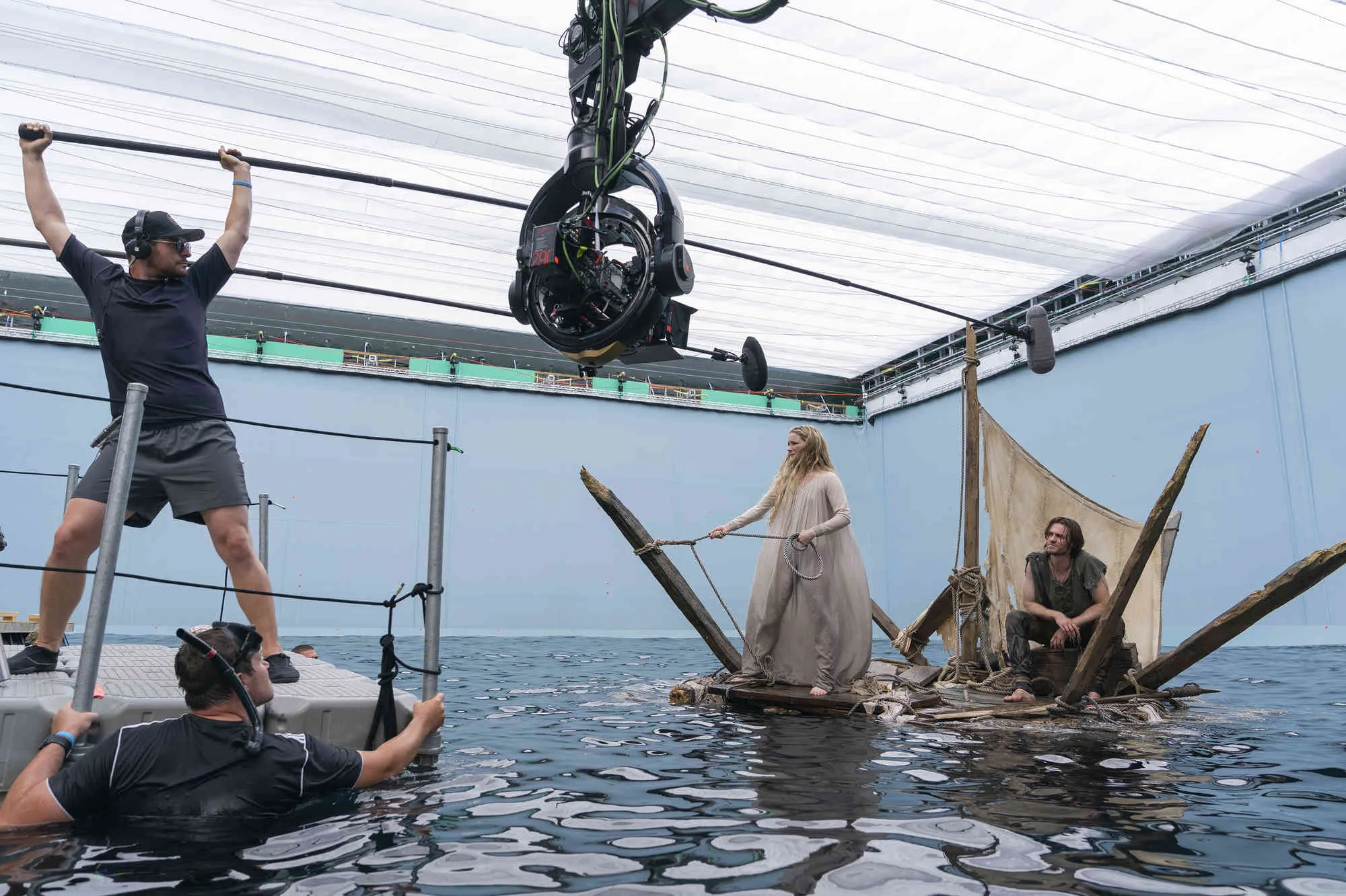 This image released by Amazon Studios shows Morfydd Clark, center, and Charlie Vickers, right, on the set of “The Lord of the Rings: The Rings of Power”. (Photo by Amazon Studios via AP Photo)