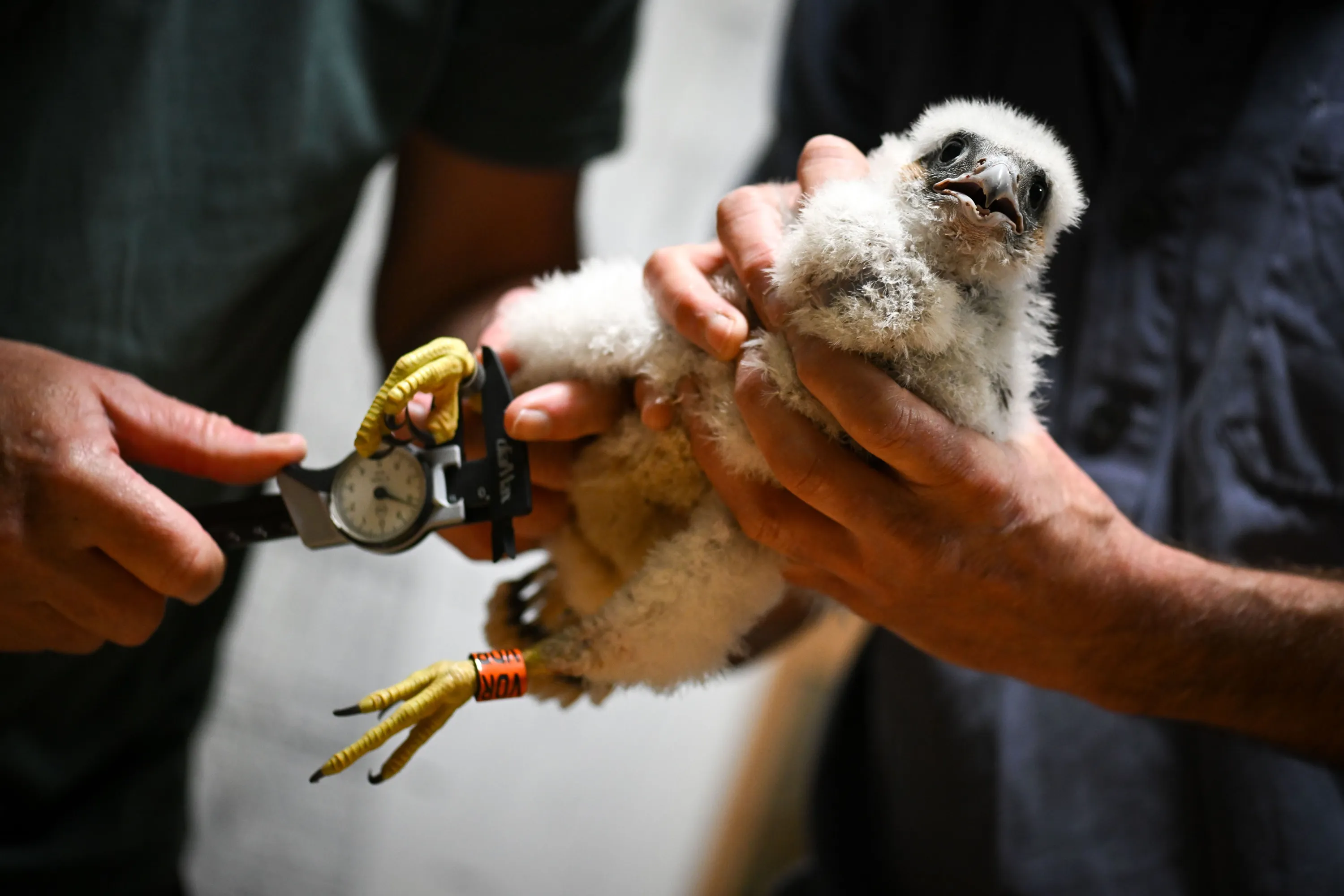 Peregrine Falcon chicks are ringed and measured at Salisbury Cathedral on May 17, 2023 in Salisbury, England. The Cathedral peregrine chicks are ringed by Nigel Jones from the British Trust for Ornithology (BTO), assisted by Phil Sheldrake, the Cathedral’s Nature Conservation Adviser. This year’s chicks, which are three weeks old, are weighed, measured and fitted with two rings, a small metal BTO (British Trust for Ornithology) ring for tracking/record-keeping and a larger orange Darvic ring so that they can be identified and tracked. The names this year are Coronation themed, with the public having voted for them. (Photo by Finnbarr Webster/Getty Images)