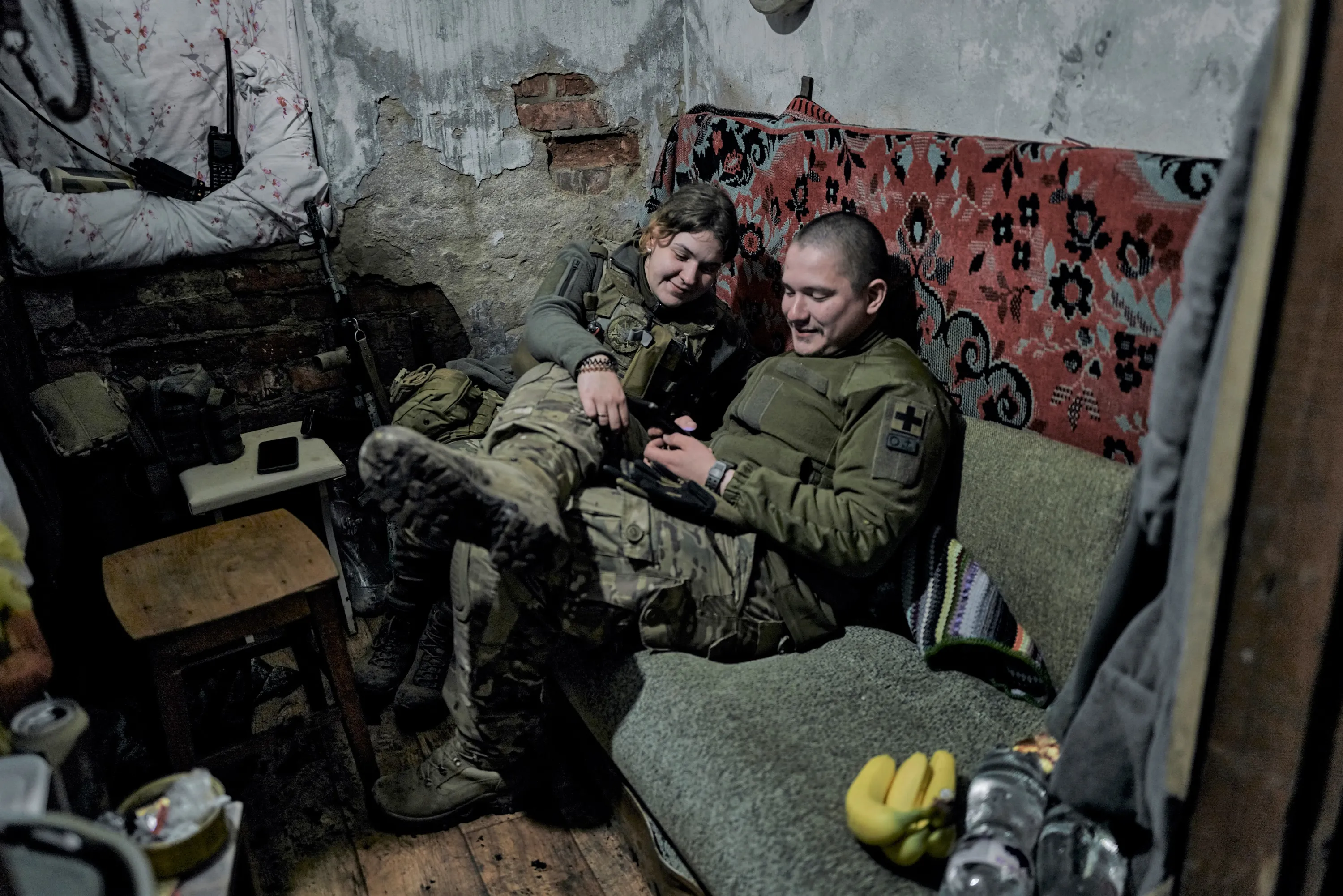 Ukrainian soldiers rest in a shelter at the frontline positions near Vuhledar, Donetsk region, Ukraine, Sunday, April 30, 2023. (Photo by Libkos/AP Photo)