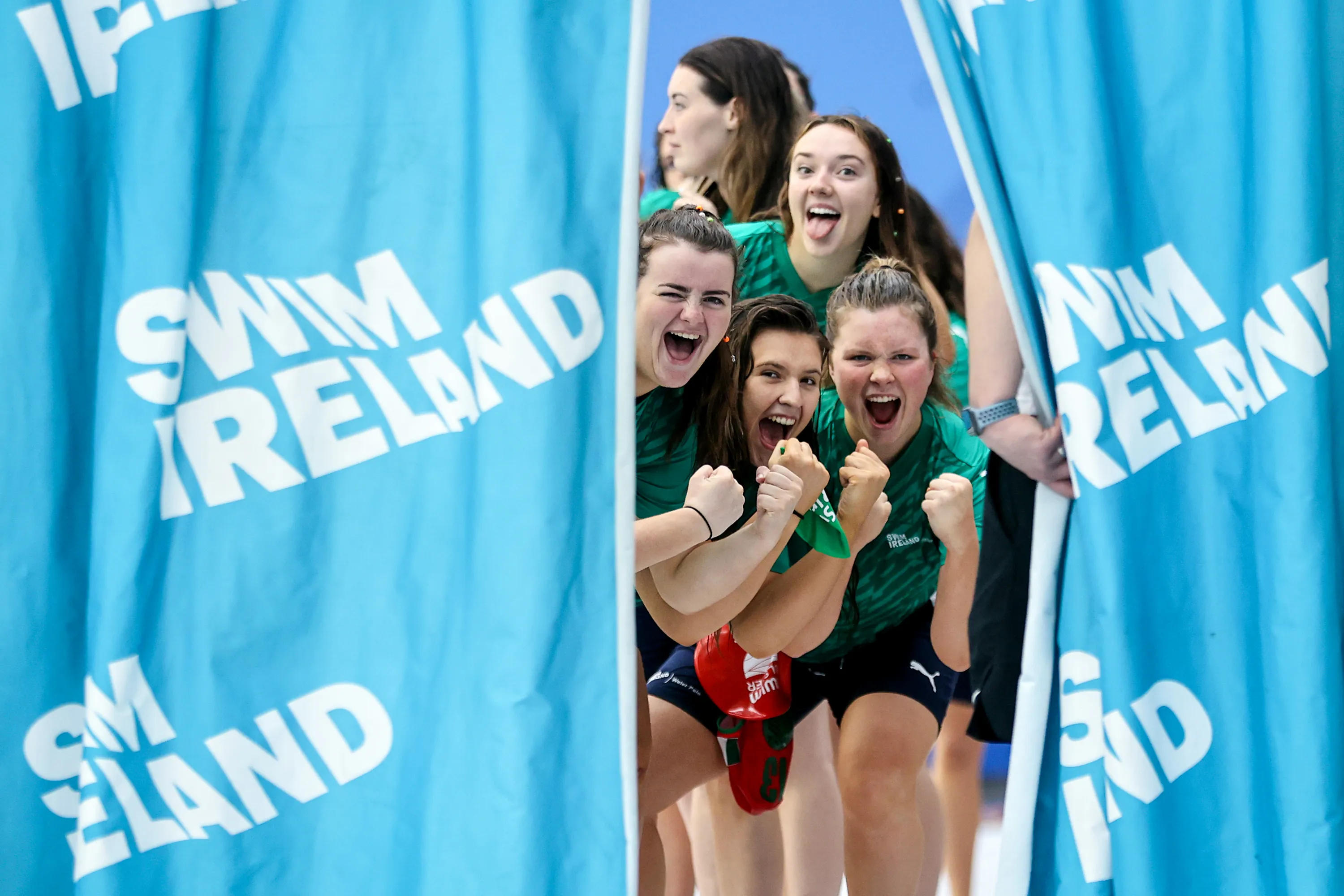 Ireland's Cara O'Kane, Hannah Taylor, Aoife Hennessey and Amelia Urry ahead of their final match of the weekend against Wales in the Water Polo Four Nations in the National Aquatic Centre, Blanchardstown, Dublin on May 21, 2023. (Photo by Ben Brady/INPHO)