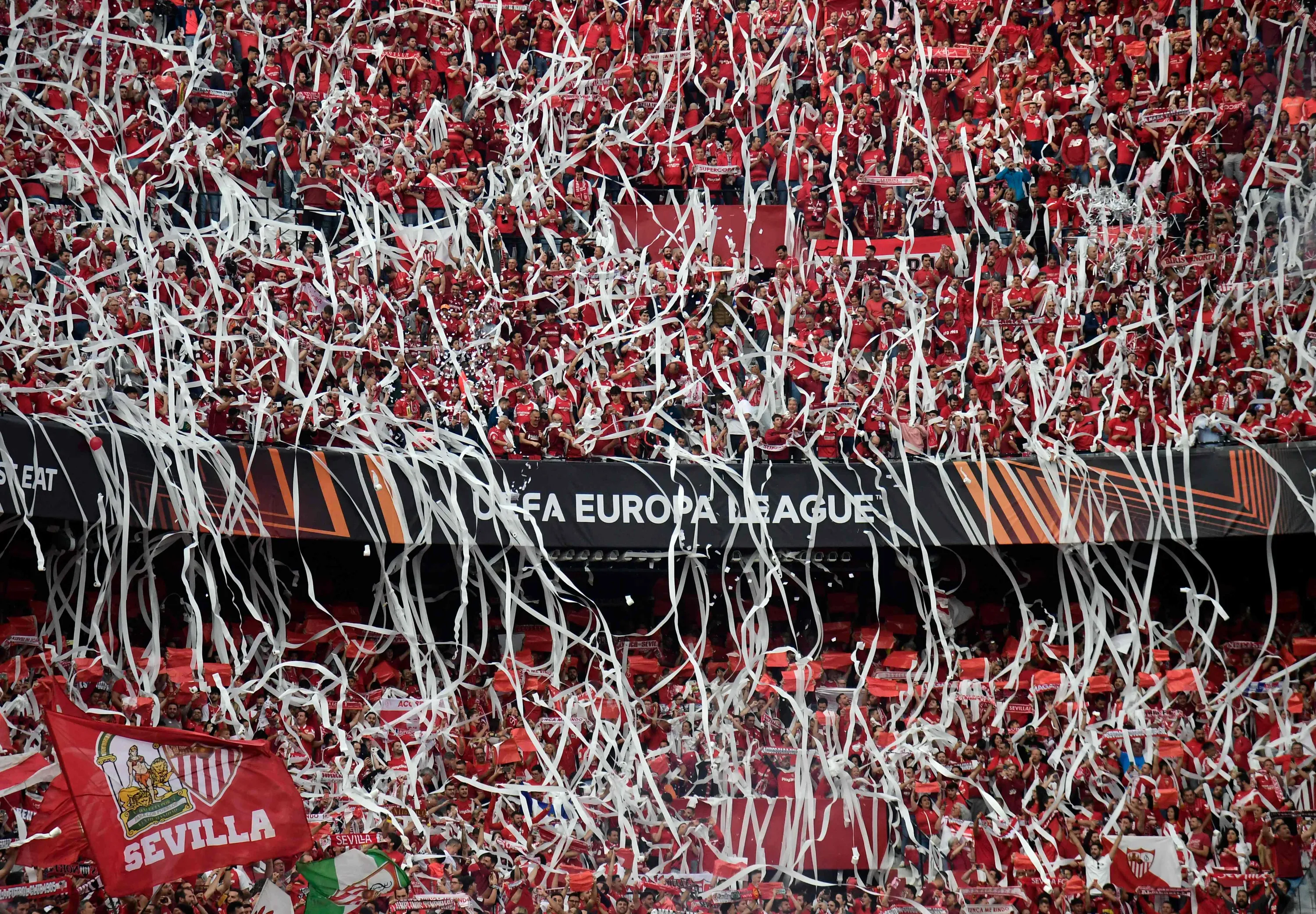 Sevilla fans cheer their team during the UEFA Europa League semi-final second leg football match between Sevilla FC and Juventus at the Ramon Sanchez Pizjuan stadium in Seville on May 18, 2023. (Photo by Cristina Quicler/AFP Photo)