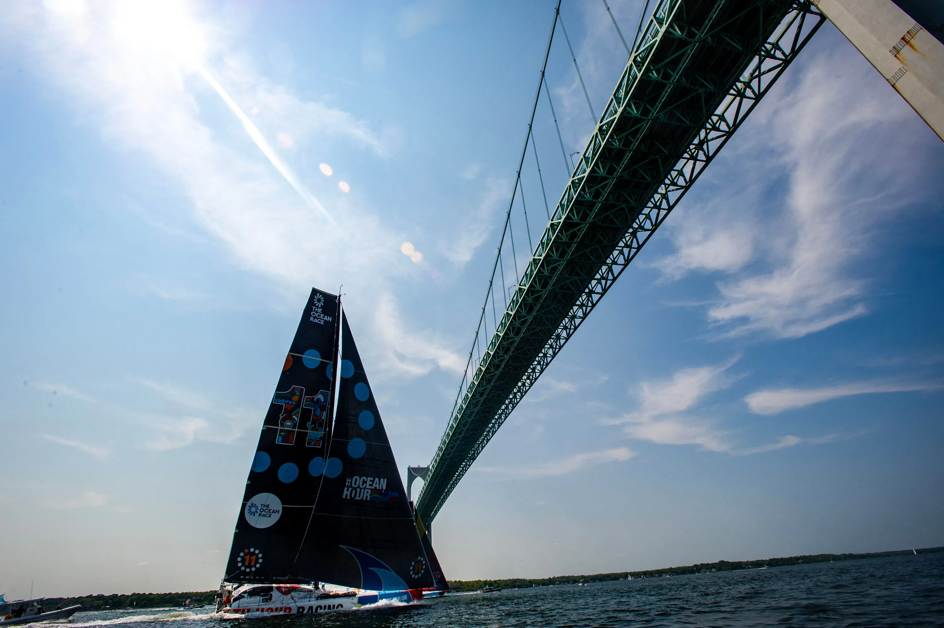 11th Hour Racing Team sails under the Newport Bridge during the in-port race and 5th leg of The Ocean Race in Newport, Rhode Island, on May 21, 2023. The Ocean Race, started in 1973, is an around the world race with seven legs and eight stopover port cities. From Newport the boats will set off on leg 5 of the race, en route to Europe, in a 3,500 nautical mile transatlantic race to Aarhus, Denmark. (Photo by Joseph Prezioso/AFP Photo)