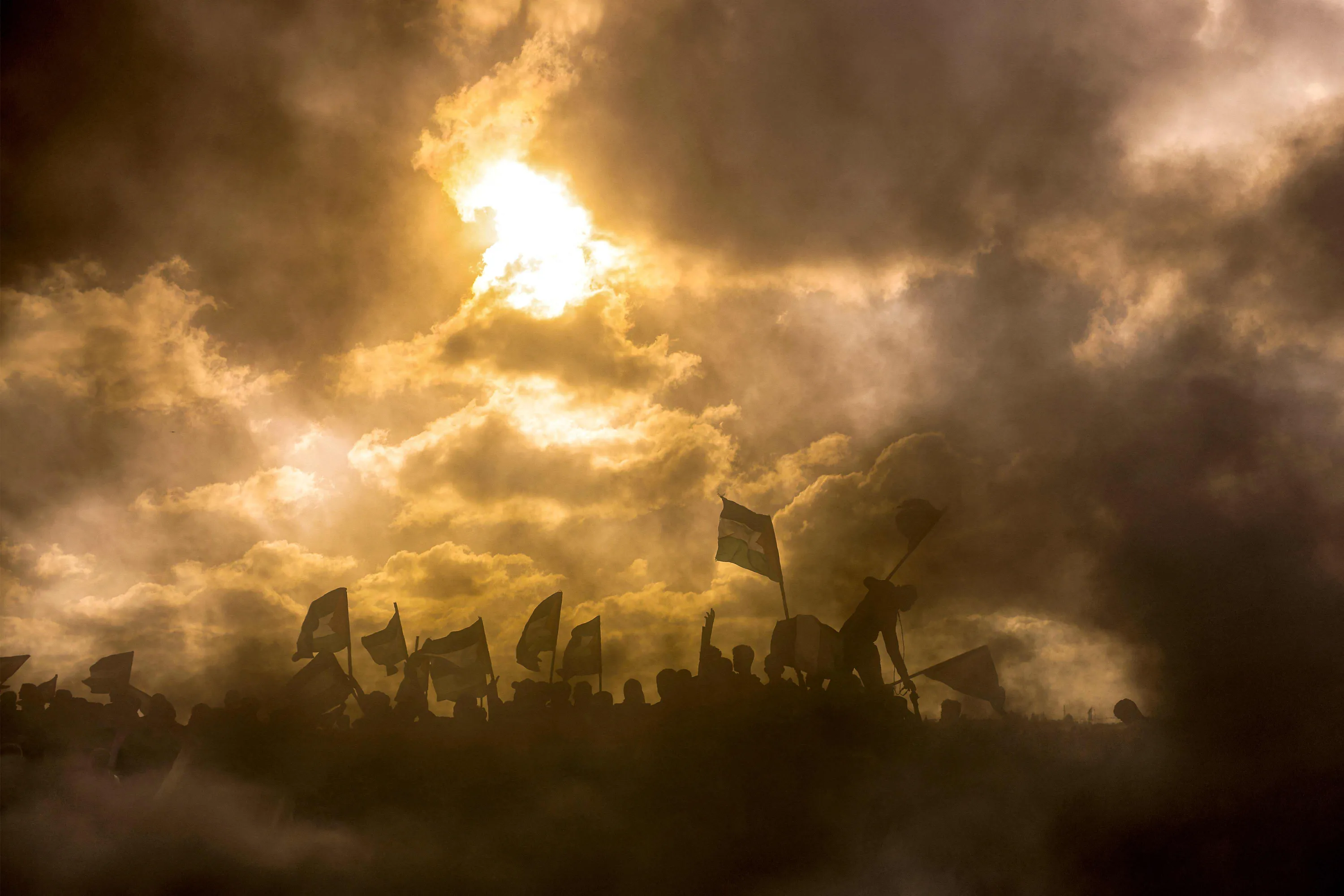Protesters gather during a Palestinian “flag march” demonstration along the border with Israel east of Gaza city on May 18, 2023 in response to the annual Israeli flag march marking “Jerusalem Day” commemorating the old city's capture by Israel. (Photo by Mohammed Abed/AFP Photo)