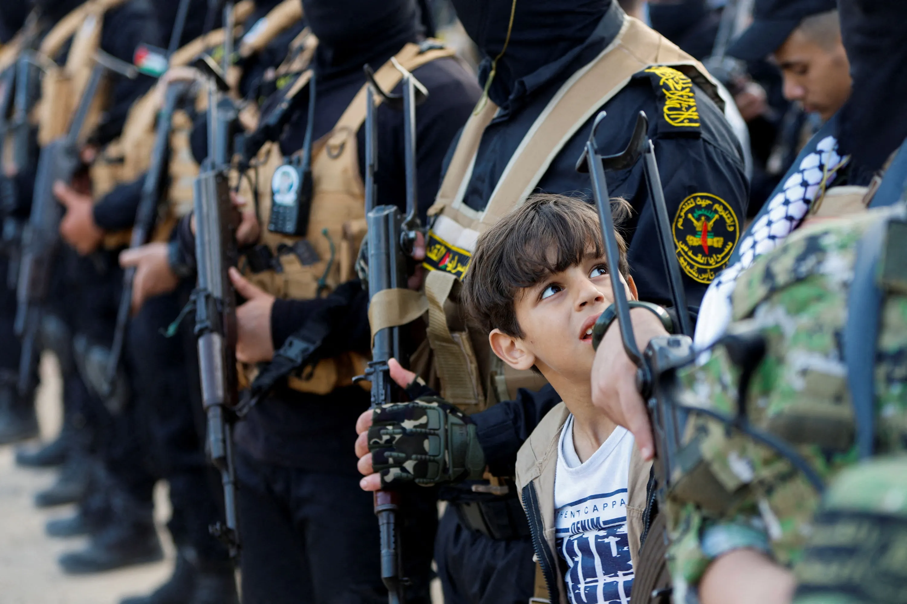 A child looks on as the Palestinian Islamic Jihad group holds a rally in Gaza to commemorate armed commanders and operatives killed by Israel in the past five-day fighting, in Gaza City on May 19, 2023. (Photo by Mohammed Salem/Reuters)