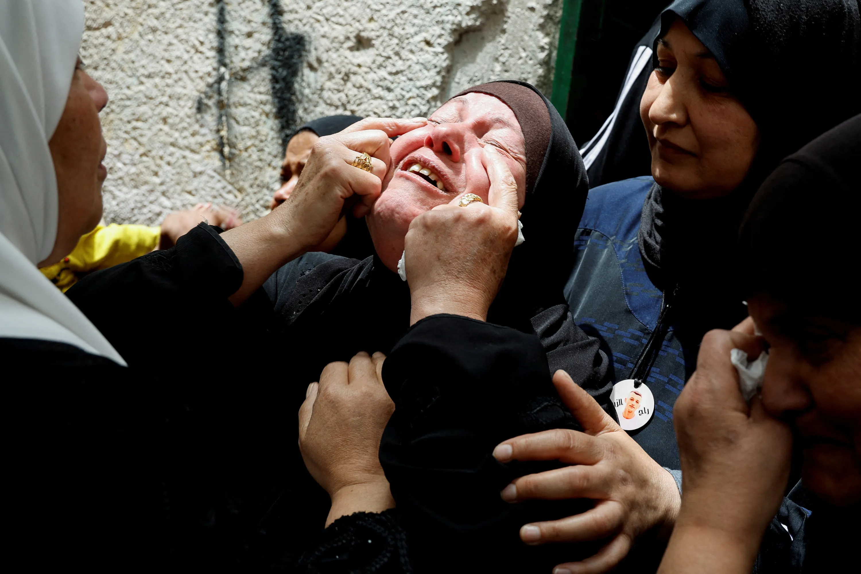 The mother of one of three Palestinian militants, who were killed in an Israeli raid, reacts during their funeral in Balata camp, Nablus, in the Israeli-occupied West Bank on May 22, 2023. (Photo by Raneen Sawafta/Reuters)