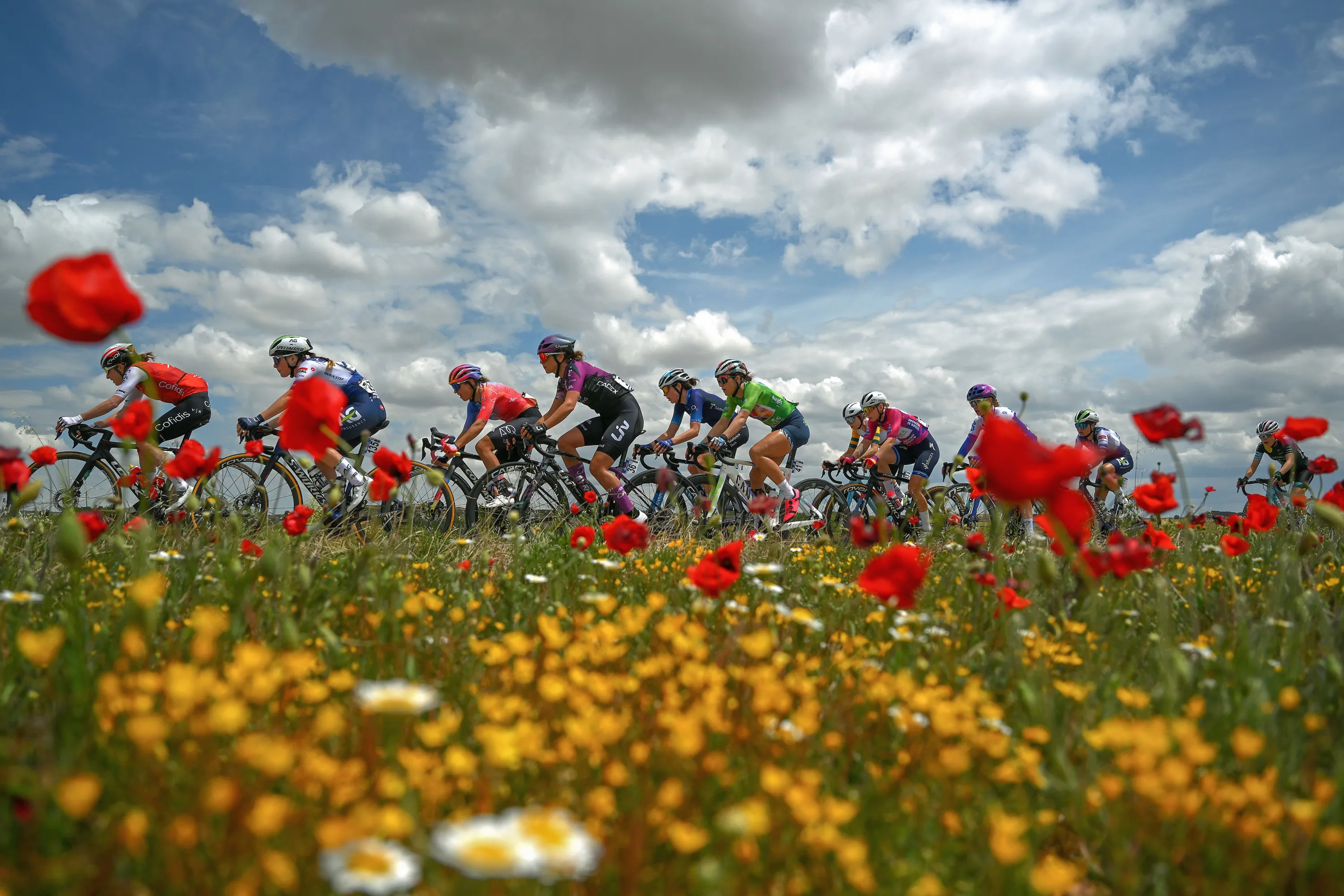 A general view of Clara Koppenburg of Germany and Team Cofidis, Gaia Masetti of Italy and Team AG Insurance-Soudal, Silvia Persico of Italy and UAE-Adq Team, Eva Buurman of The Netherlands and LIV Racing-TeqFind Team, Aude Biannic of France and Movistar Team, Chloe Dygert of The United States and Canyon-SRAM Racing Team - Green points jersey, Brodie Chapman of Australia and Team Trek-Segafredo, Lorena Wiebes of The Netherlands and Team SD Worx - Purple Leader Jersey and the peloton passing through flowery landscape during the 8th Vuelta a Burgos Feminas 2023, Stage 3 a 112.7km stage from Caleruega to Aranda de Duero / #UCIWWT / on May 20, 2023 in Aranda de Duero, Spain. (Photo by Dario Belingheri/Getty Images)