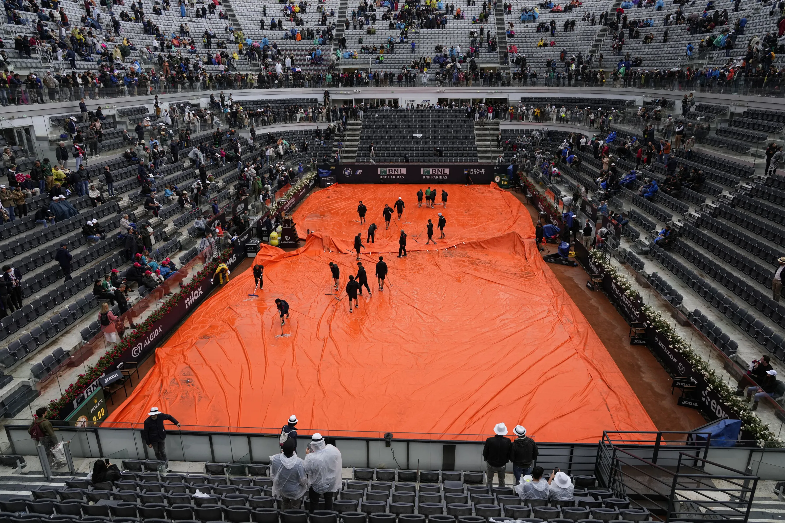 Stewards push water off the rain cover as rain delays the start of the men's final tennis match between Daniil Medvedev of Russia and Denmark's Holger Rune at the Italian Open tennis tournament in Rome, Italy, Sunday, May 21, 2023. (Photo by Alessandra Tarantino/AP Photo)