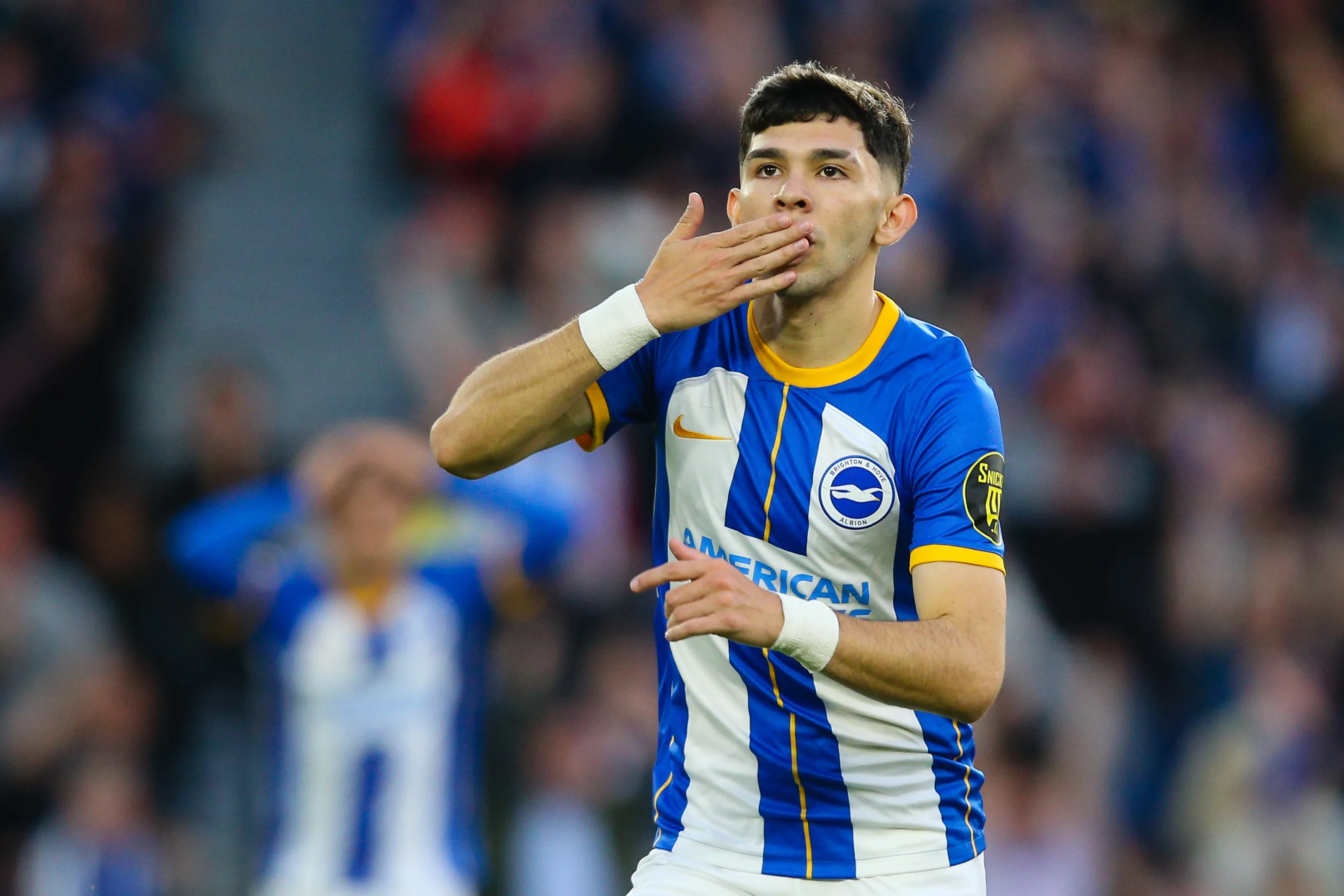 Julio Enciso of Brighton & Hove Albion celebrates scoring his side's equalising goal to make the score 1-1 during the Premier League match between Brighton & Hove Albion and Manchester City at American Express Community Stadium on May 24, 2023 in Brighton, England. (Photo by Craig Mercer/MB Media/Getty Images)