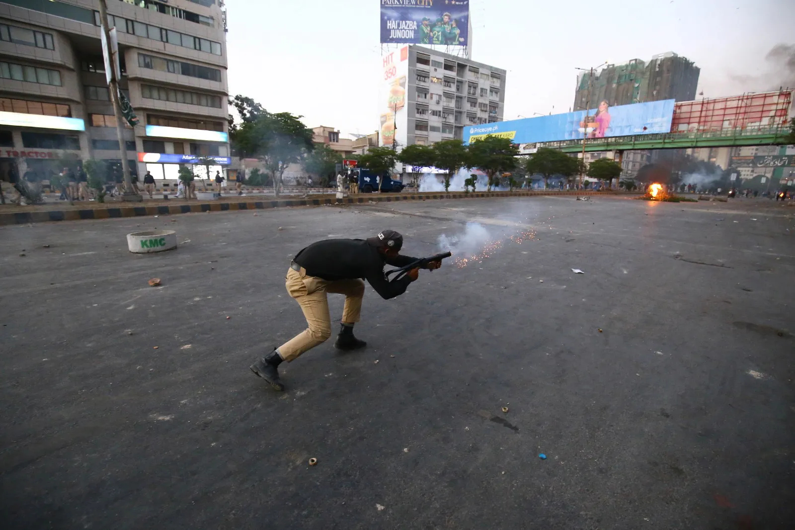 A police officer fires a gas launcher as supporters of Pakistan's former Prime Minister Imran Khan clash with police during a protest against Khan's arrest, in Karachi, Pakistan, 09 May 2023. (Photo by Shahzaib Akber/EPA)