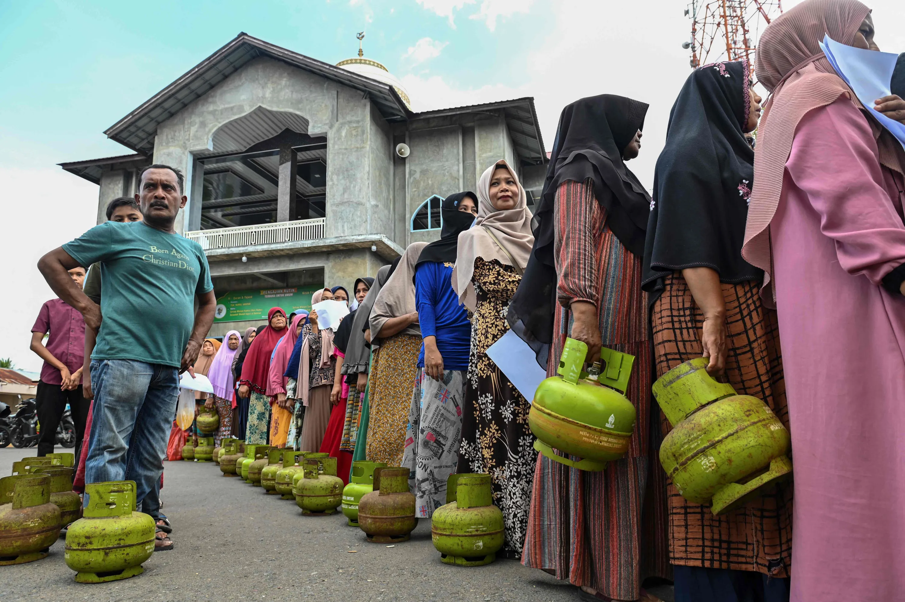 People queue with gas cylinders to buy subsidised Liquefied Petroleum Gas (LPG) for cooking at a distribution centre in Lambaro, Indonesia's Aceh province on May 2, 2023. (Photo by Chaideer Mahyuddin/AFP Photo)
