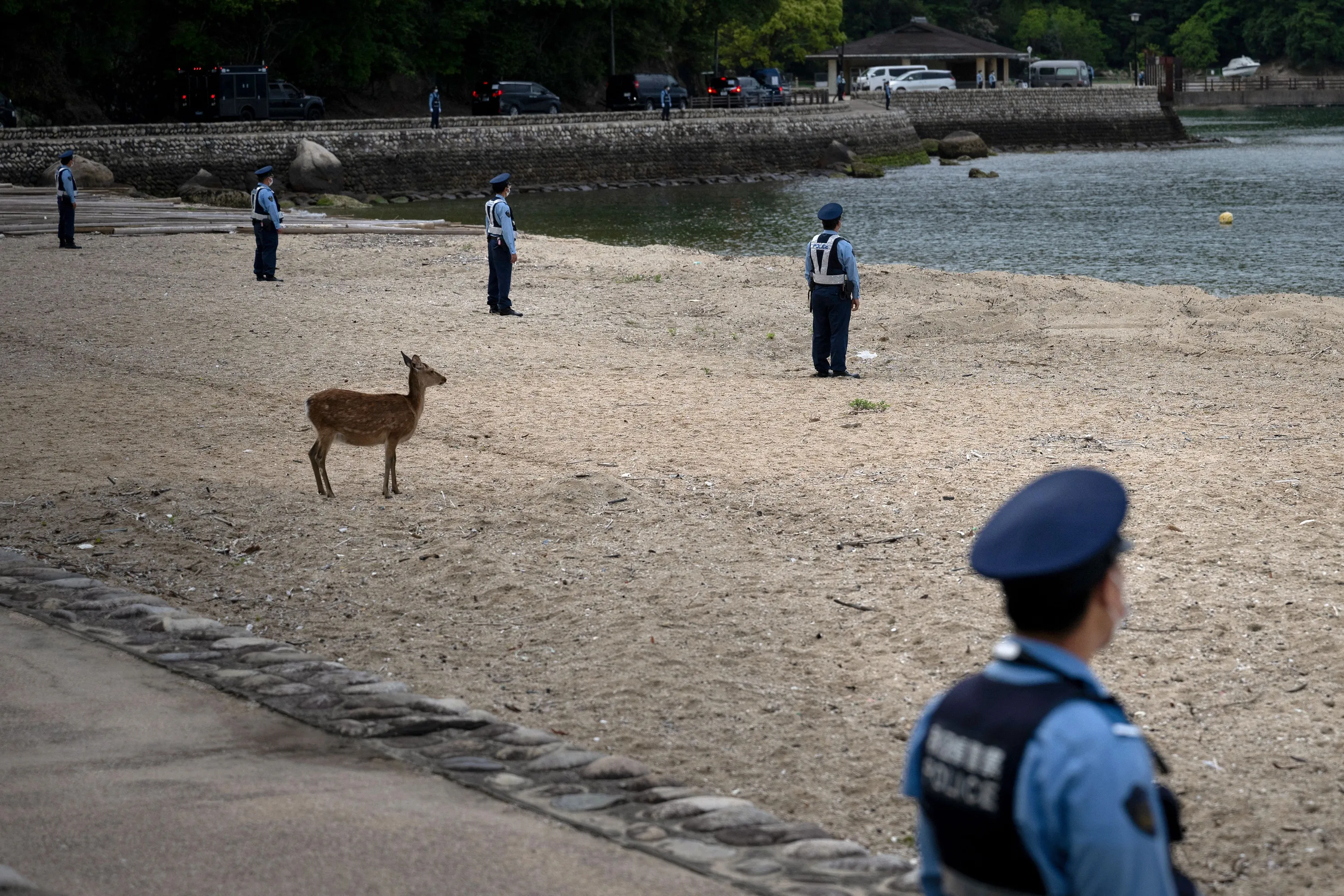 Policemen stand guard as the motorcade of US President Joe Biden travels to the Itsukushima Shrine in Miyajima Island during a visit as part of the G7 Leaders' Summit, on May 19, 2023. (Photo by Brendan Smialowski/AFP Photo)