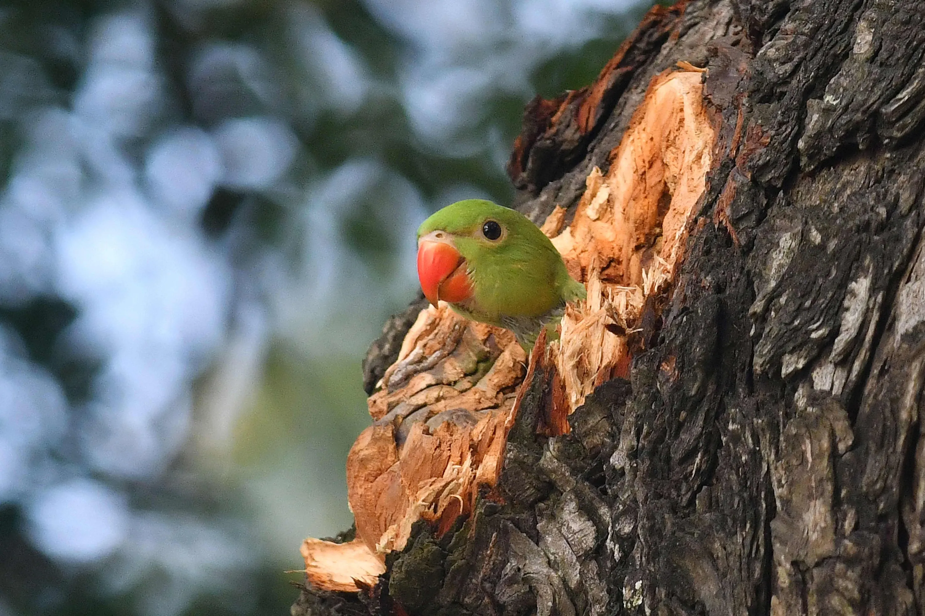A parrot chick looks out from its nest in a tree in Guwahati, India on May 12, 2023. (Photo by Biju Boro/AFP Photo)