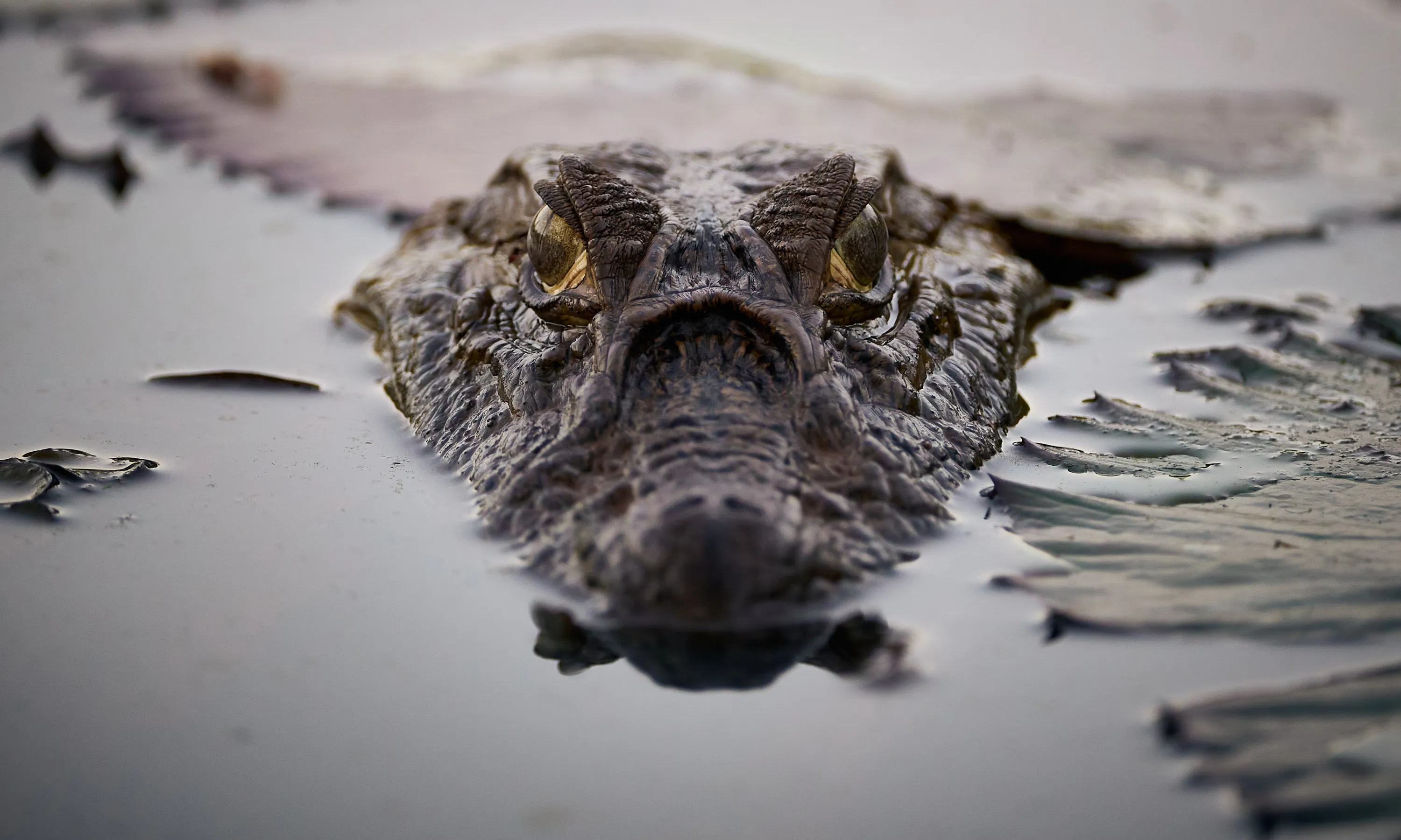 An alligator lurks among water lilies at dusk in Edmundo Navarro de Andrade state forest in Rio Claro city, São Paulo, Brazil on May 14, 2023. (Photo by Igor do Vale/Rex Features/Shutterstock)