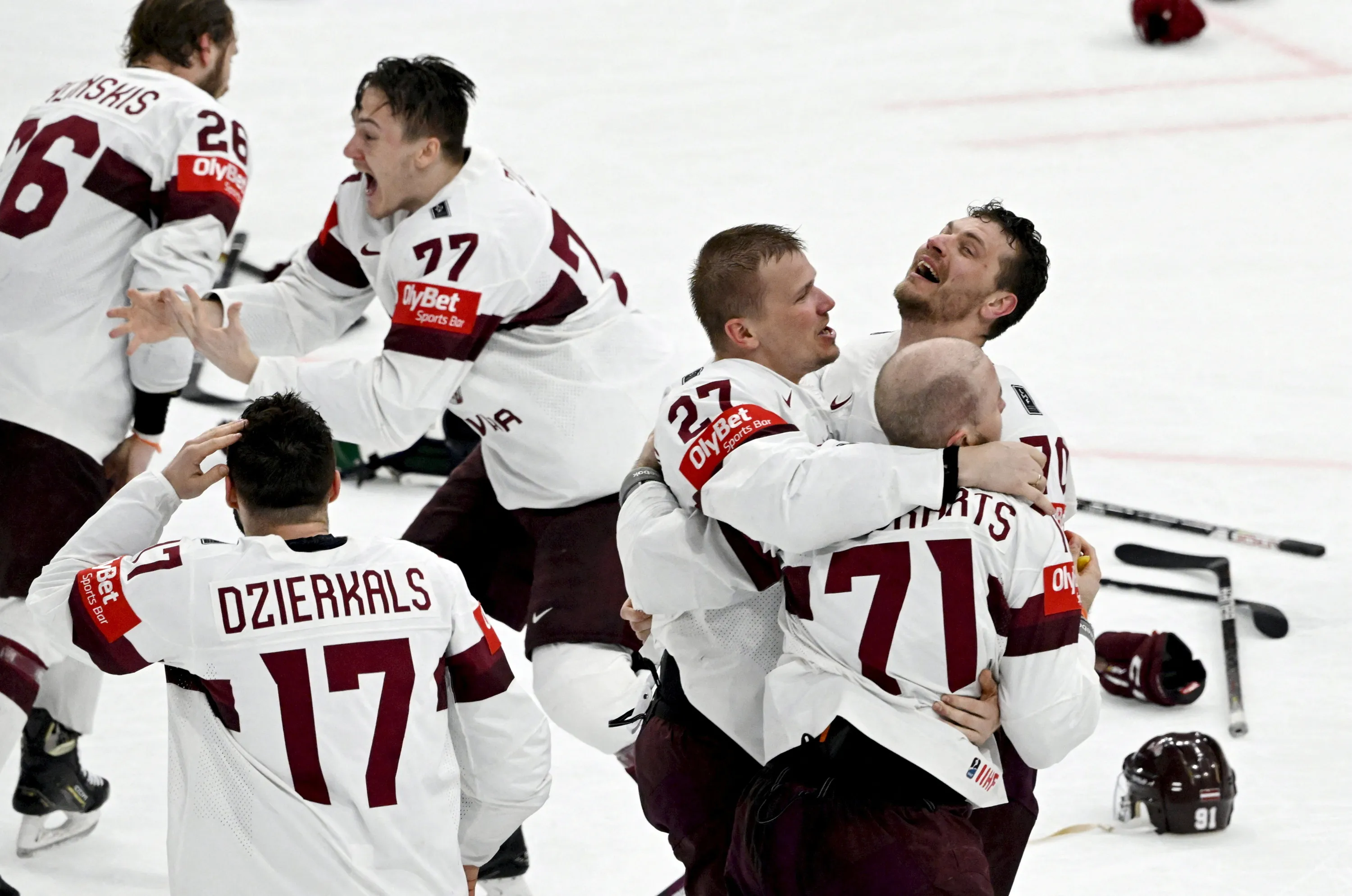 Latvia players celebrate after winning bronze during United States v Latvia in IIHF World Ice Hockey Championship 2023 at Nokia Arena in Tampere, Finland on May 28, 2023. (Photo by Jussi Nukari/Lehtikuva via Reuters)