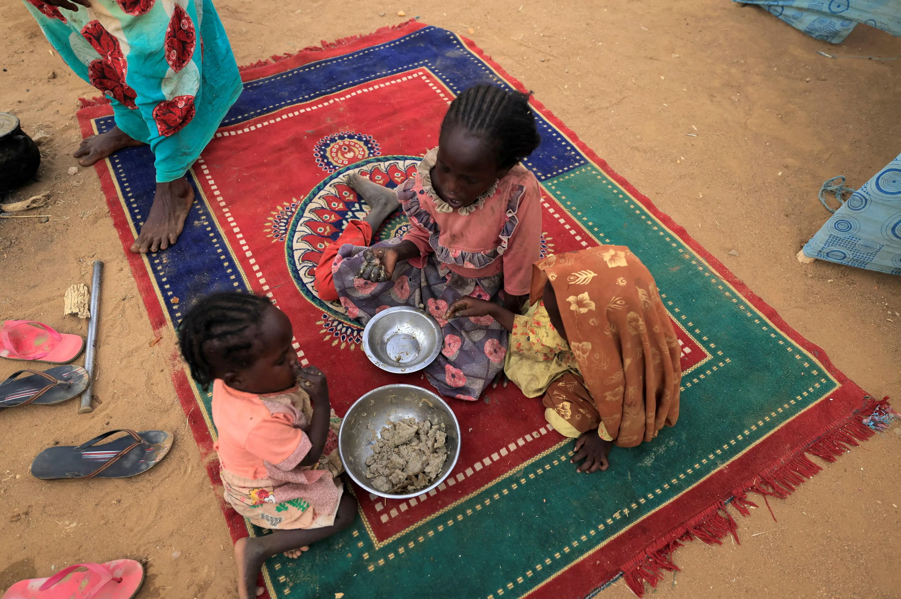 Sudanese refugee children who have fled the violence in Sudan's Darfur region eat their breakfast beside makeshift shelters near the border between Sudan and Chad in Koufroun, Chad on May 11, 2023. (Photo by Zohra Bensemra/Reuters)