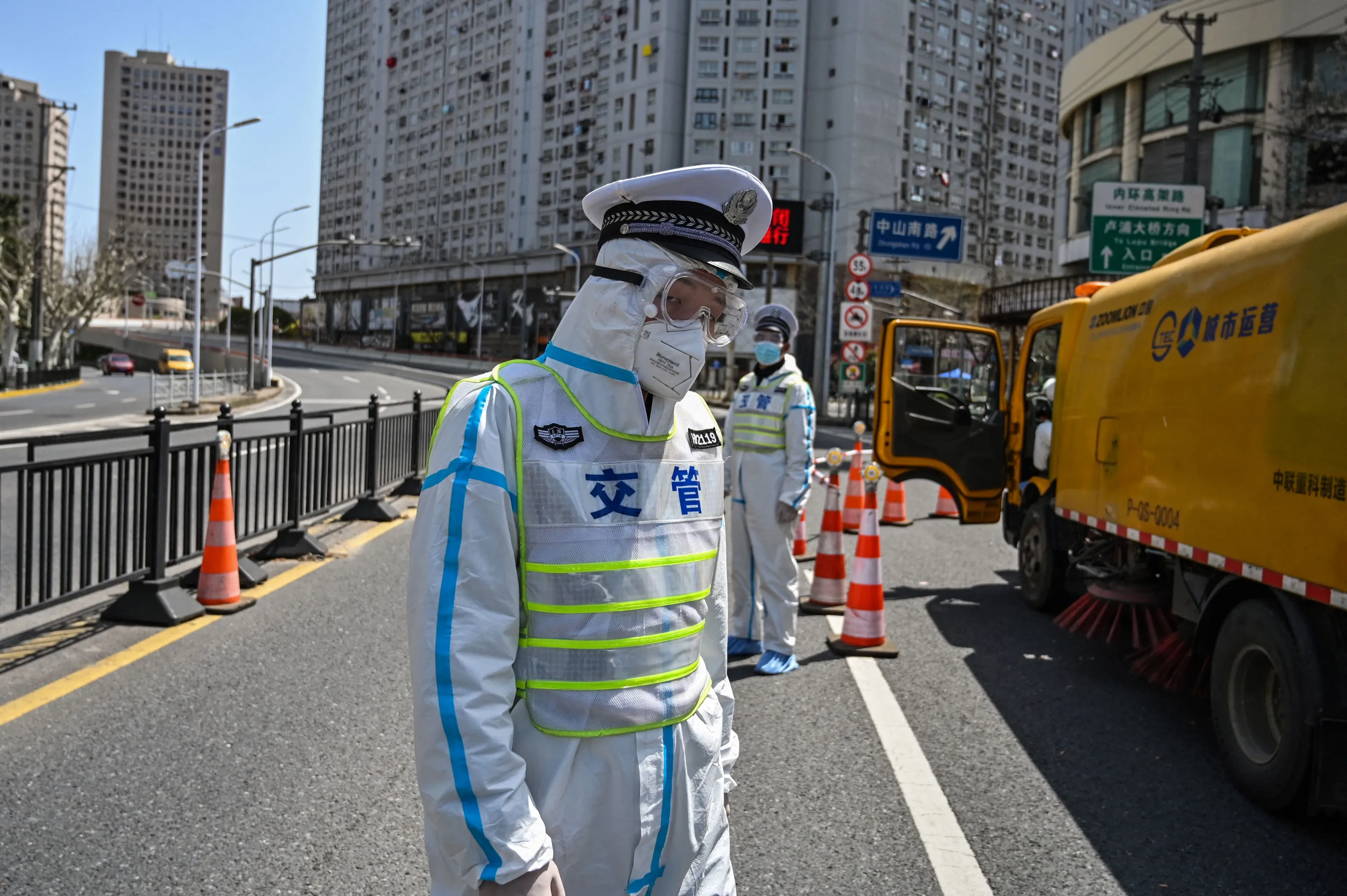 Transit officers, wearing a protective gear, control access to a bridge in the direction of Pudong district in lockdown as a measure against the Covid-19 coronavirus, in Shanghai on March 29, 2022. (Photo by Hector Retamal/AFP Photo)