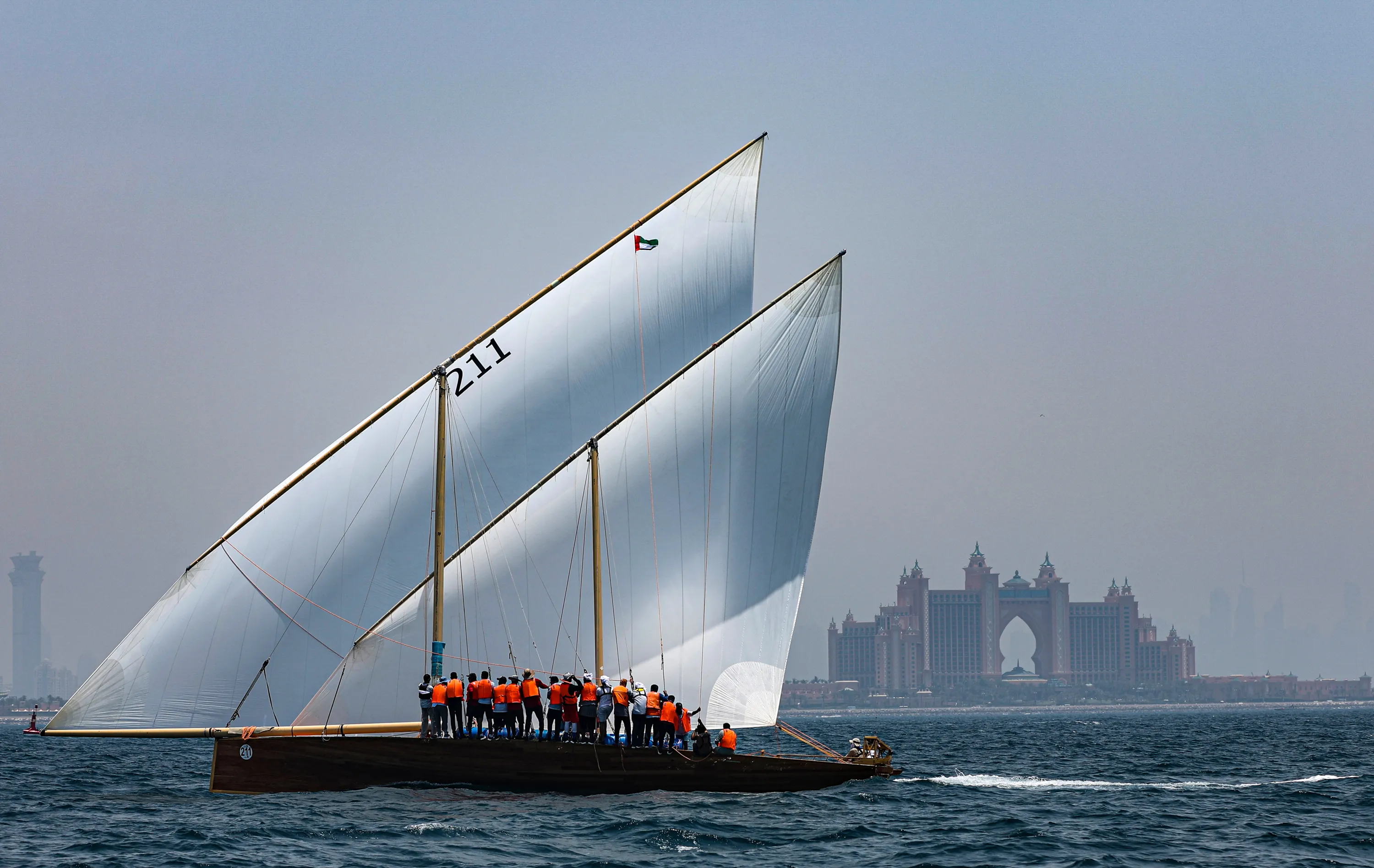 Crew of Namran dhow owned by Sheikh Zayed bin Hamdan bin Zayed Al Nahyan compete on their way to win the Al Gaffal Dhow Race, with Atlantis luxury hotel in the background outside Dubai, United Arab Emirates, 30 May 2023. Al Gaffal long distance Sur Bin Na'air 60ft Traditional Dhow Race, in a traditional Dhow boat, is the biggest traditional sailing race in the world. 125 boats take part in the race which starts from Sur Bu Na'air Island and reaches the finish line at the luxury hotel of Burj Al Arab in the coast of Dubai passing by Moon Island. The race was conceived by the late Sheikh Hamdan bin Rashid Al Maktoum and currently under patronage of the Crown Prince of Dubai H.H. Sheikh Hamdan Bin Mohammed Al Maktoum which is seeking to protect the heritage and the traditional marine sports. (Photo by Ali Haider/EPA)
