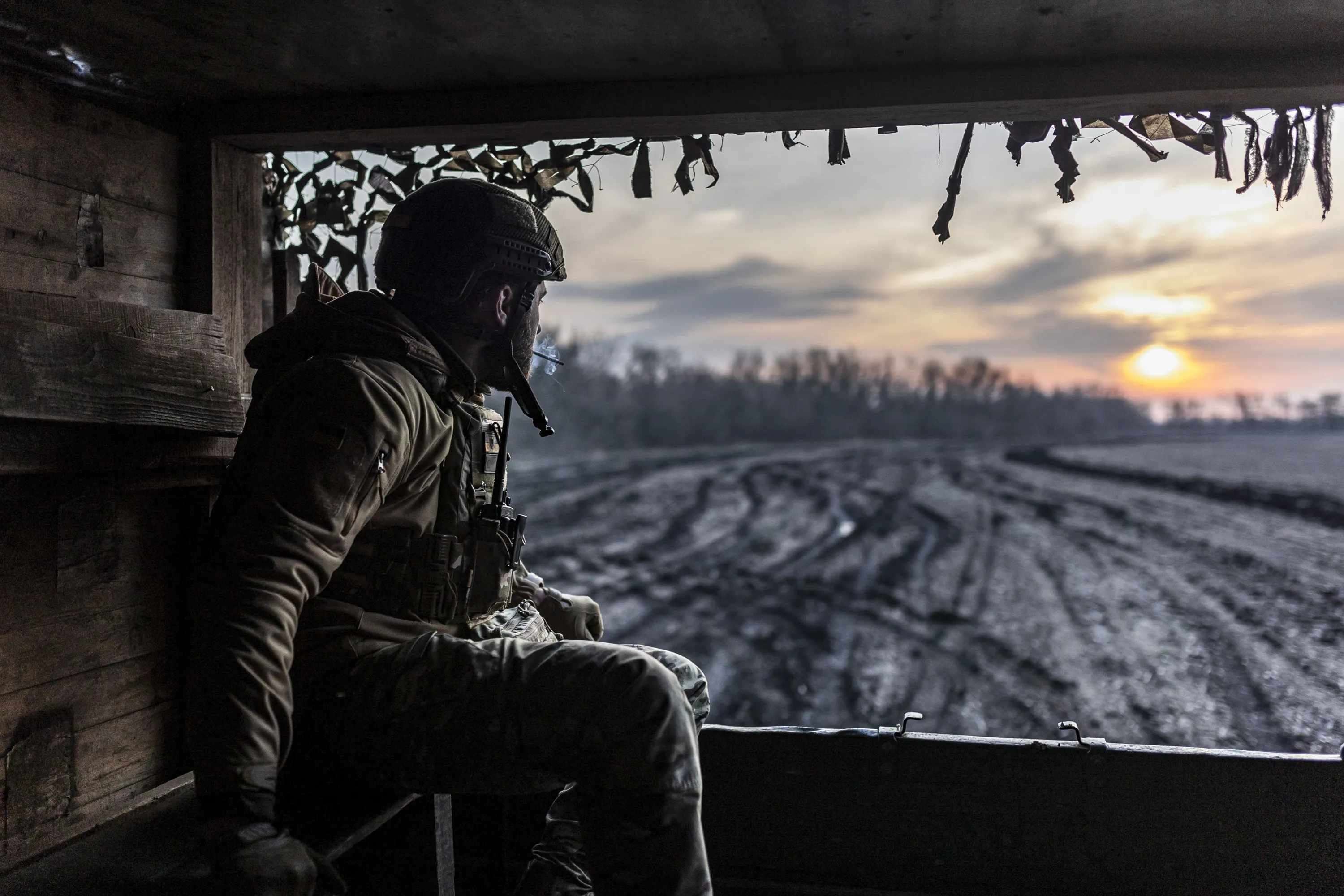 Ukrainian soldier of the Aidar battalion heading to an artillery position in Donetsk oblast, 4 April 2023. (Photo by Diego Herrera Carcedo/Anadolu Agency via Getty Images)