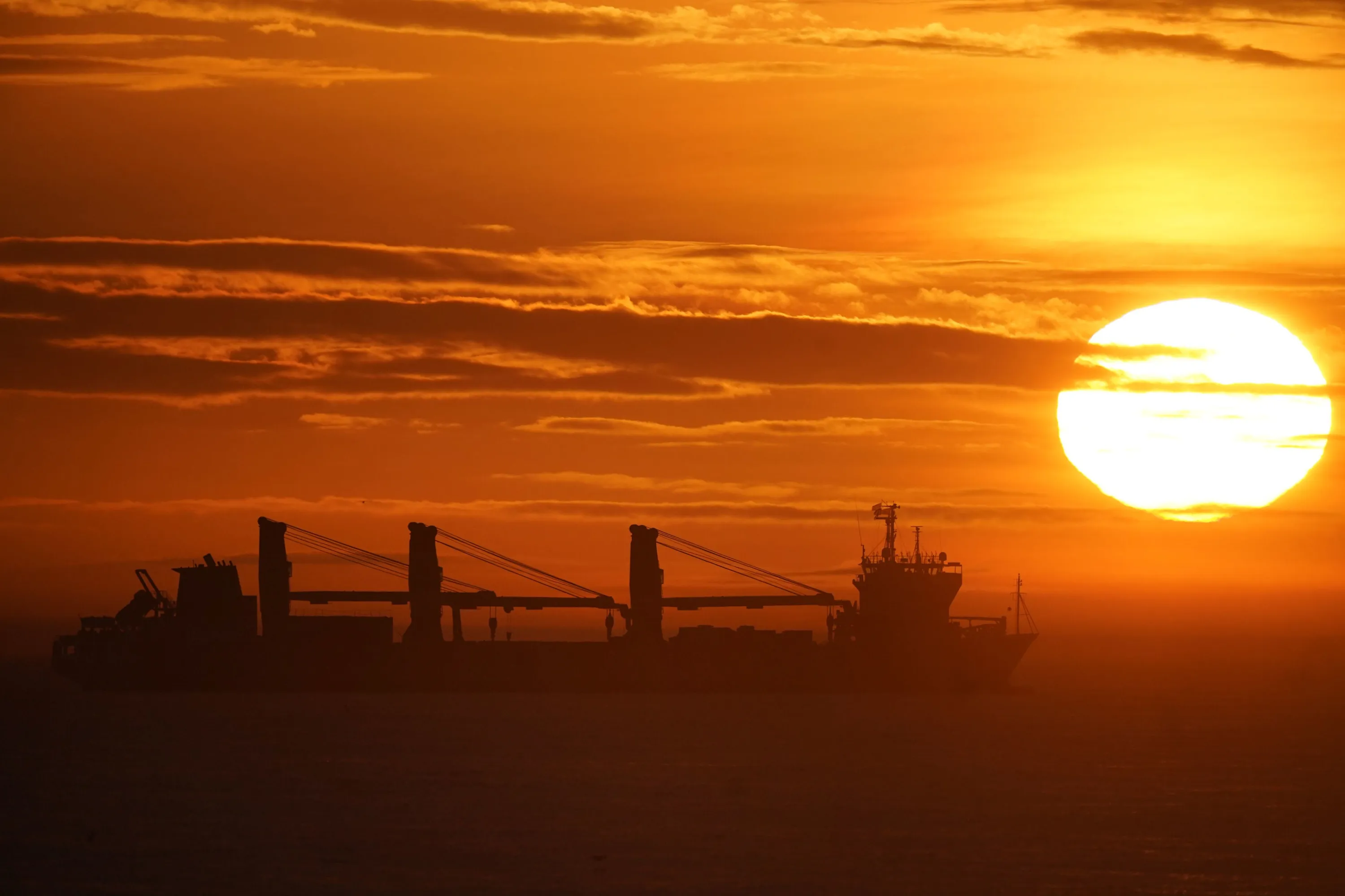 The cargo ship “Maria” sits on the horizon as the sun rises over Brown's Bay in North Tyneside, England on Wednesday, March 29, 2023. (Photo by Owen Humphreys/PA Images via Getty Images)