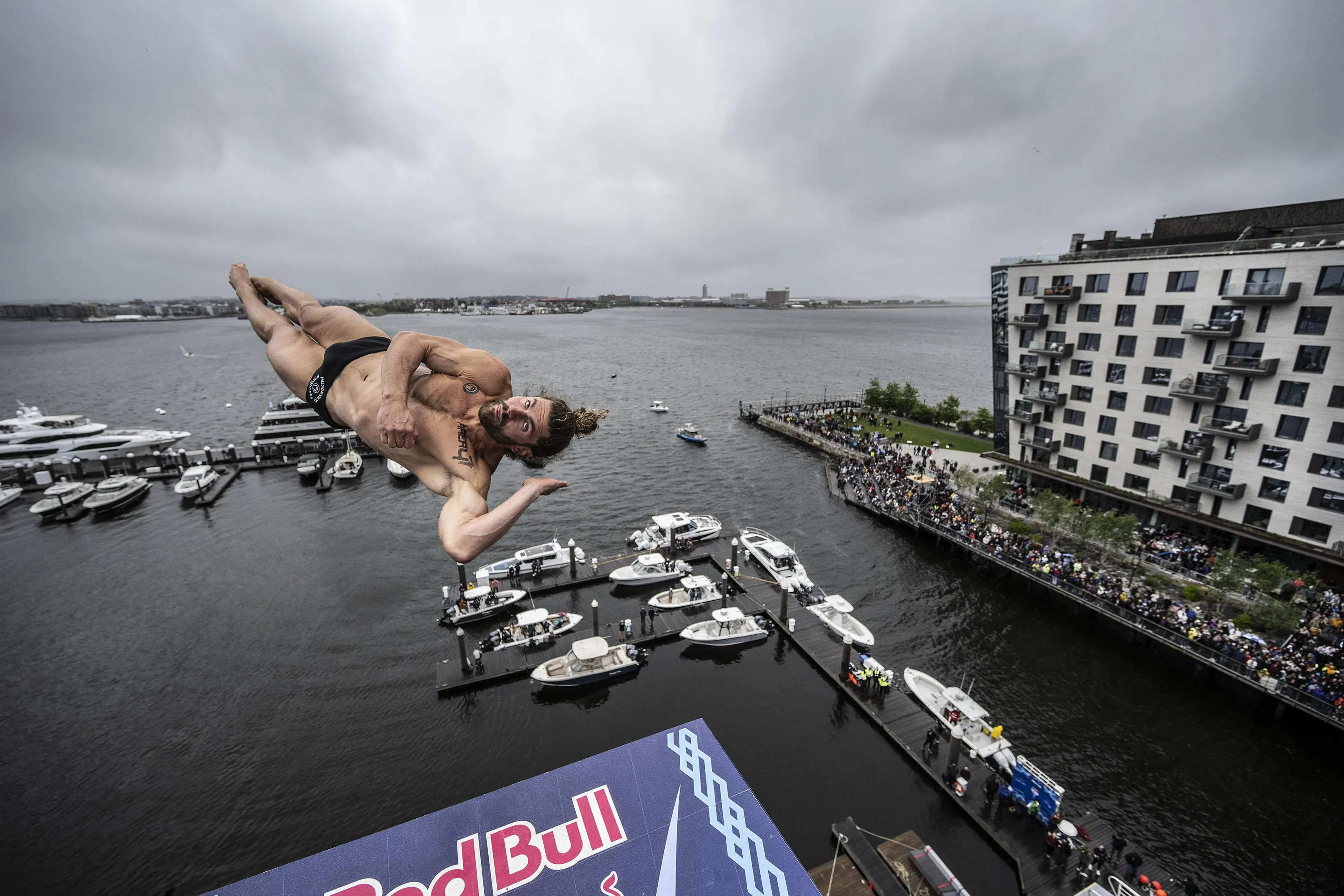 In this handout image provided by Red Bull, David Colturi of the U.S. dives from the 27.5-metre platform on the Institute of Contemporary Art during the final competition day of the first stop of the Red Bull Cliff Diving World Series on June 03, 2023 at Boston, Massachusetts. (Photo by Dean Treml/Red Bull via Getty Images)