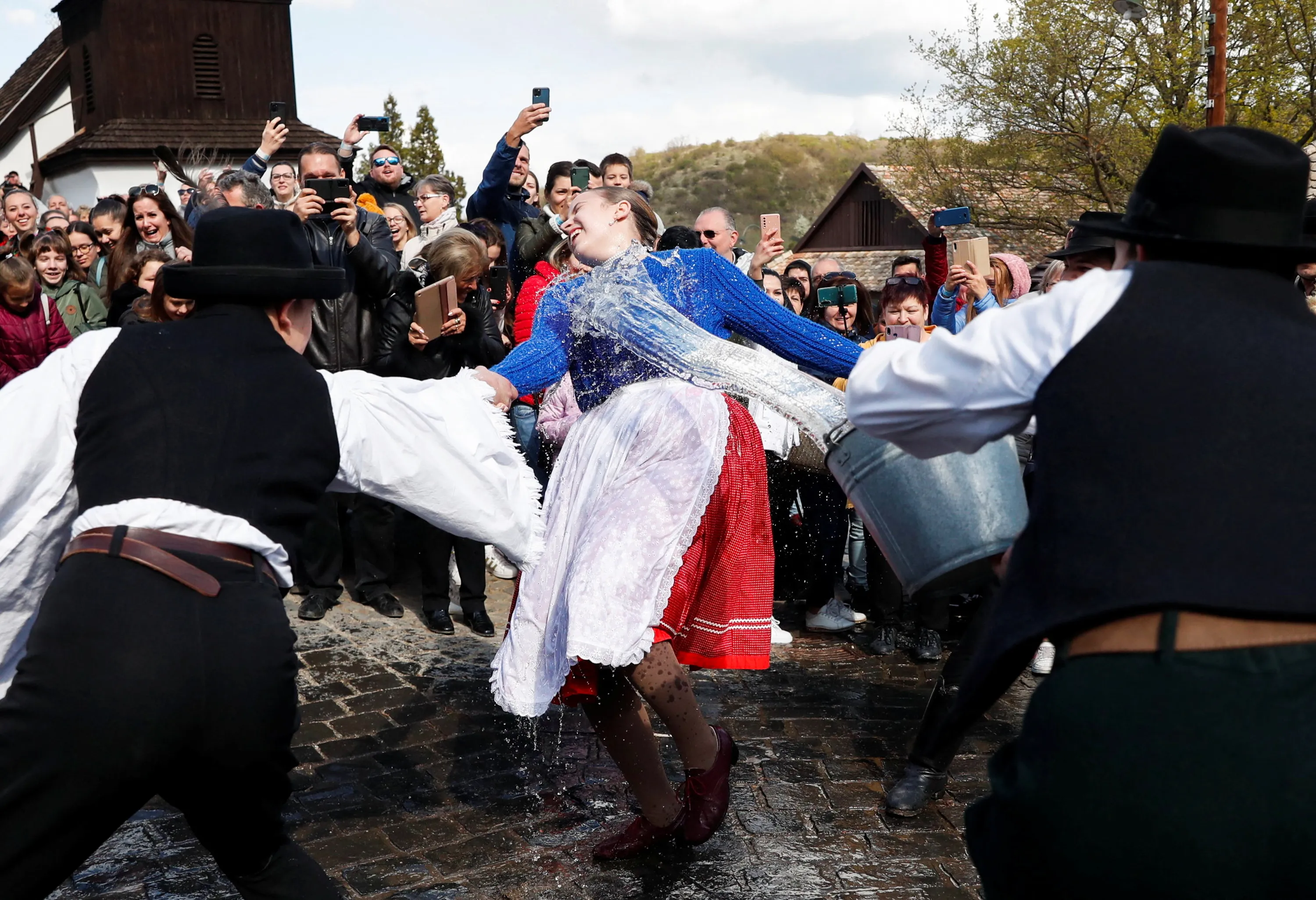 A woman dressed in traditional clothes reacts as men throw water at her during a traditional Easter celebration in Holloko, Hungary on April 18, 2022. (Photo by Bernadett Szabo/Reuters)