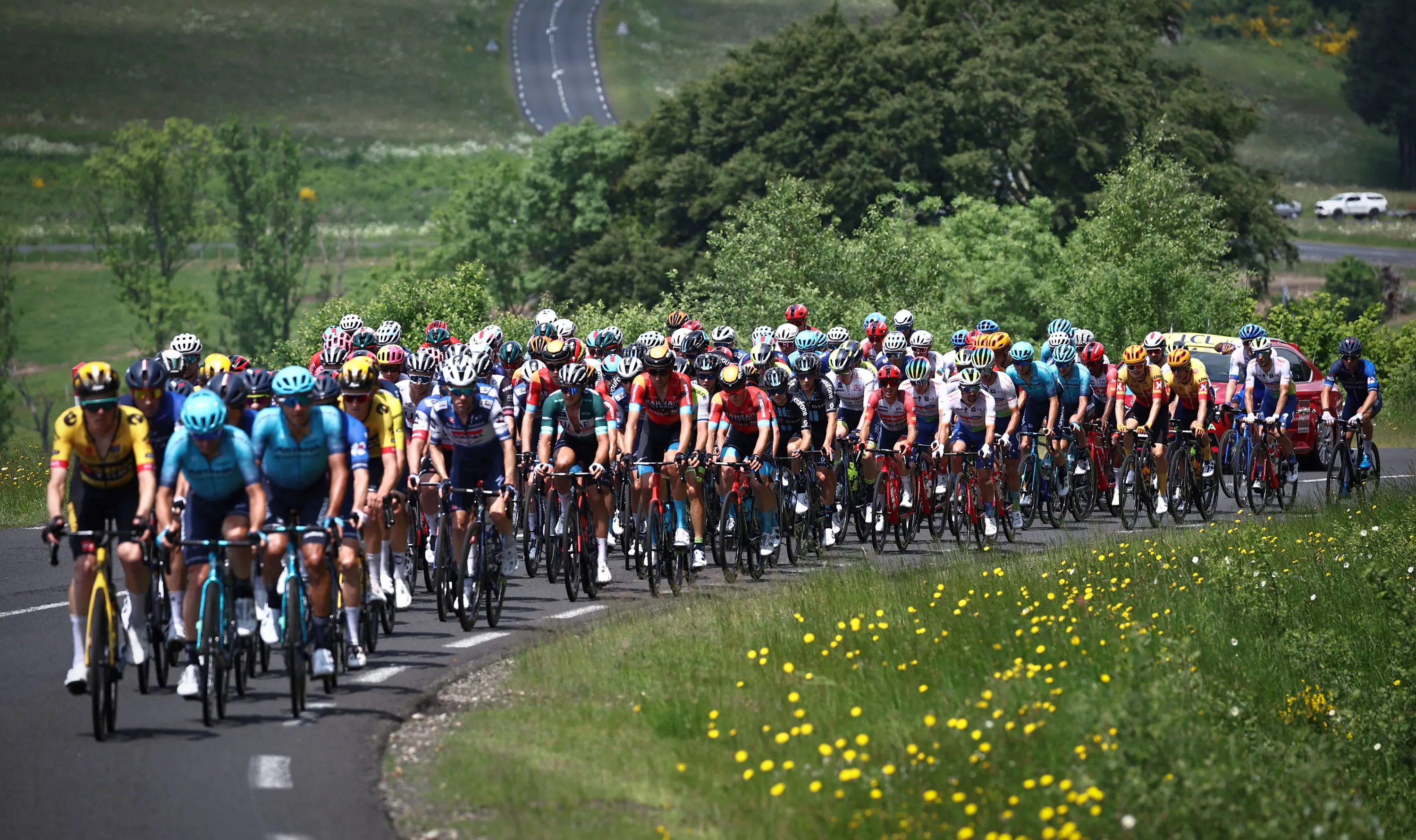 The pack rides during the second stage of the 75th edition of the Criterium du Dauphine cycling race, 167,3 kms betwenn Brassac-les-Mines and La Chaise-Dieu, central France, on June 5, 2023. (Photo by Anne-Christine Poujoulat/AFP Photo)