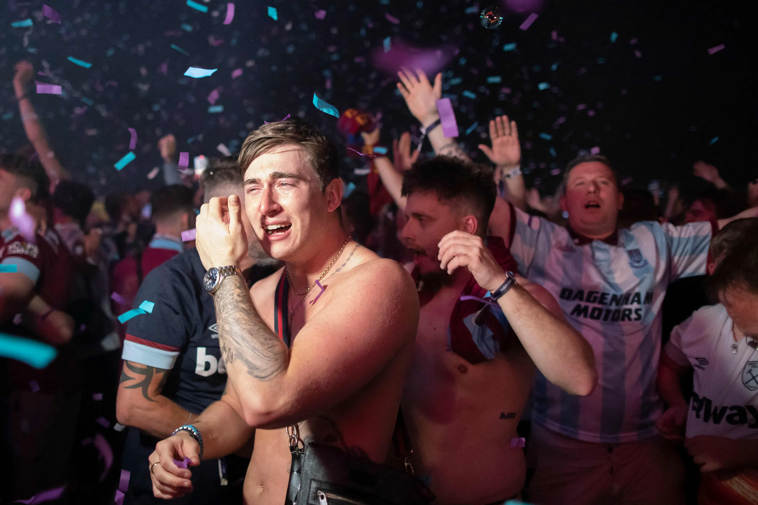 Fans of West Ham United celebrate in the fanzone at Letna after winning the UEFA Europa Conference League final football match between ACF Fiorentina and West Ham United FC in Prague, Czech Republic on June 7, 2023. (Photo by Stringer/AFP Photo)