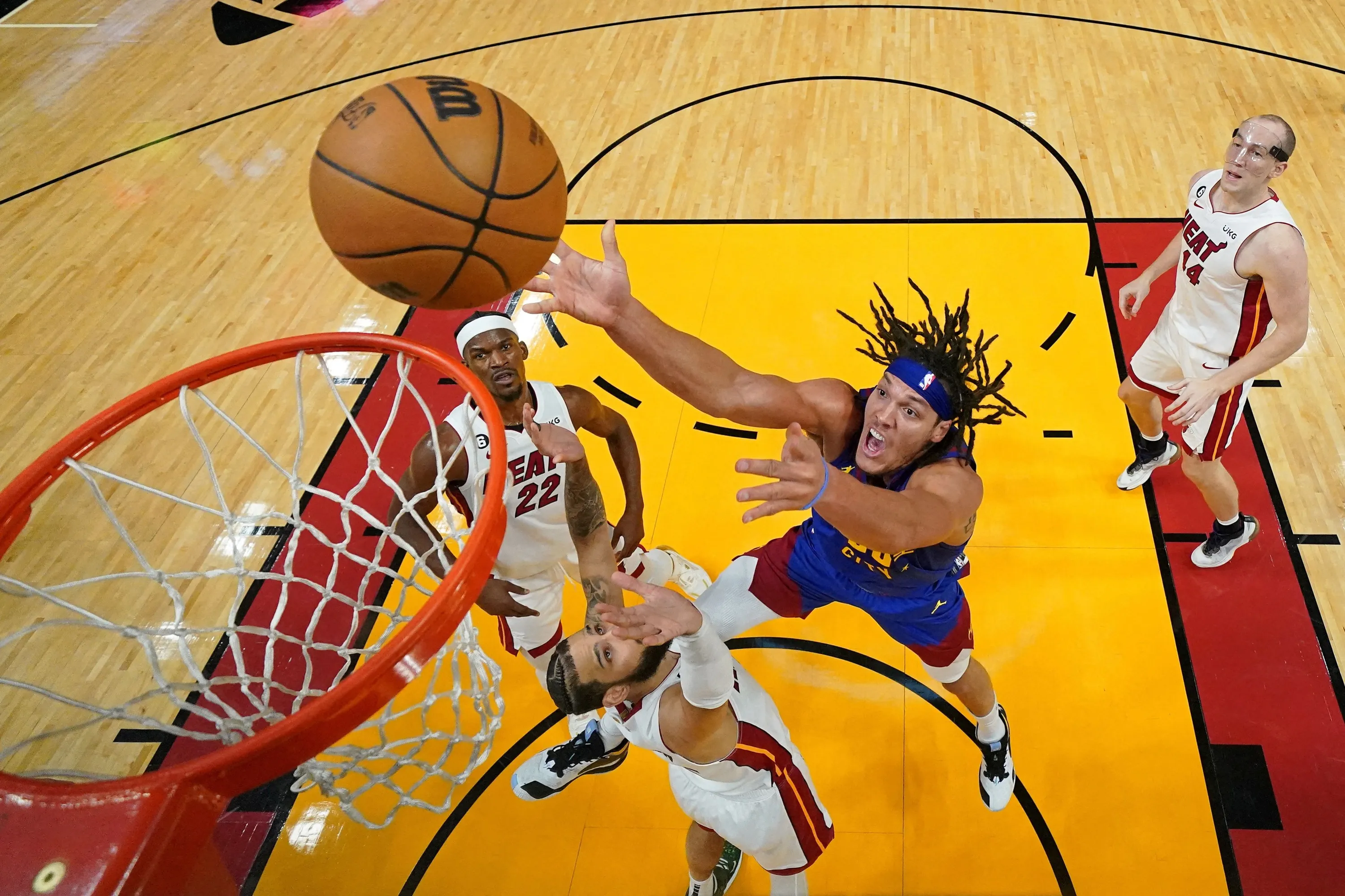 Denver Nuggets forward Aaron Gordon (50) shoots the ball against Miami Heat forward Caleb Martin (16) during the first half in game three of the 2023 NBA Finals at Kaseya Center in Miami, Florida on June 7, 2023. (Photo by Kyle Terada/USA TODAY Sports)