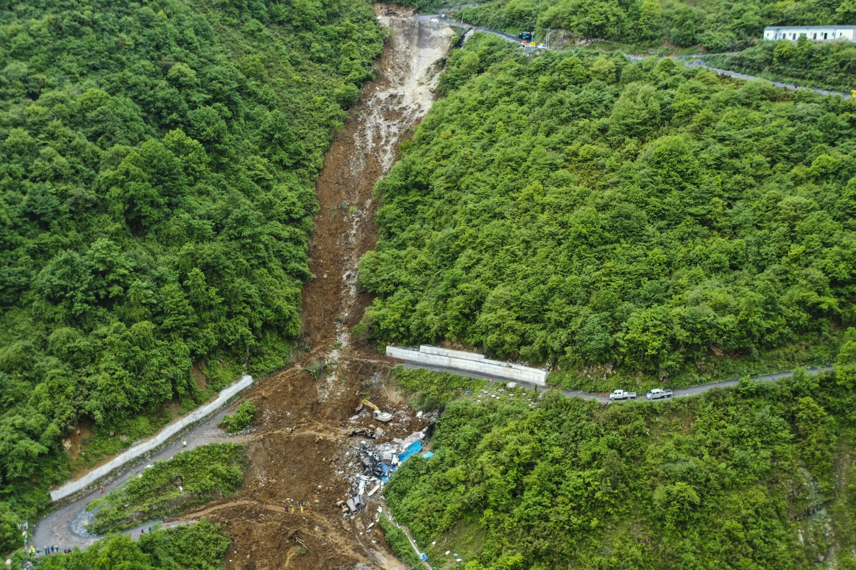 This aerial photo released by the Xinhua News Agency shows the site of a mountain collapse in Leshan in southwestern China's Sichuan Province on Sunday, June 4, 2023. A landslide tore through a mining company's worker dormitory early Sunday morning in southwestern China, killing more than a dozen people, authorities said. (Photo by Xinhua via AP Photo)