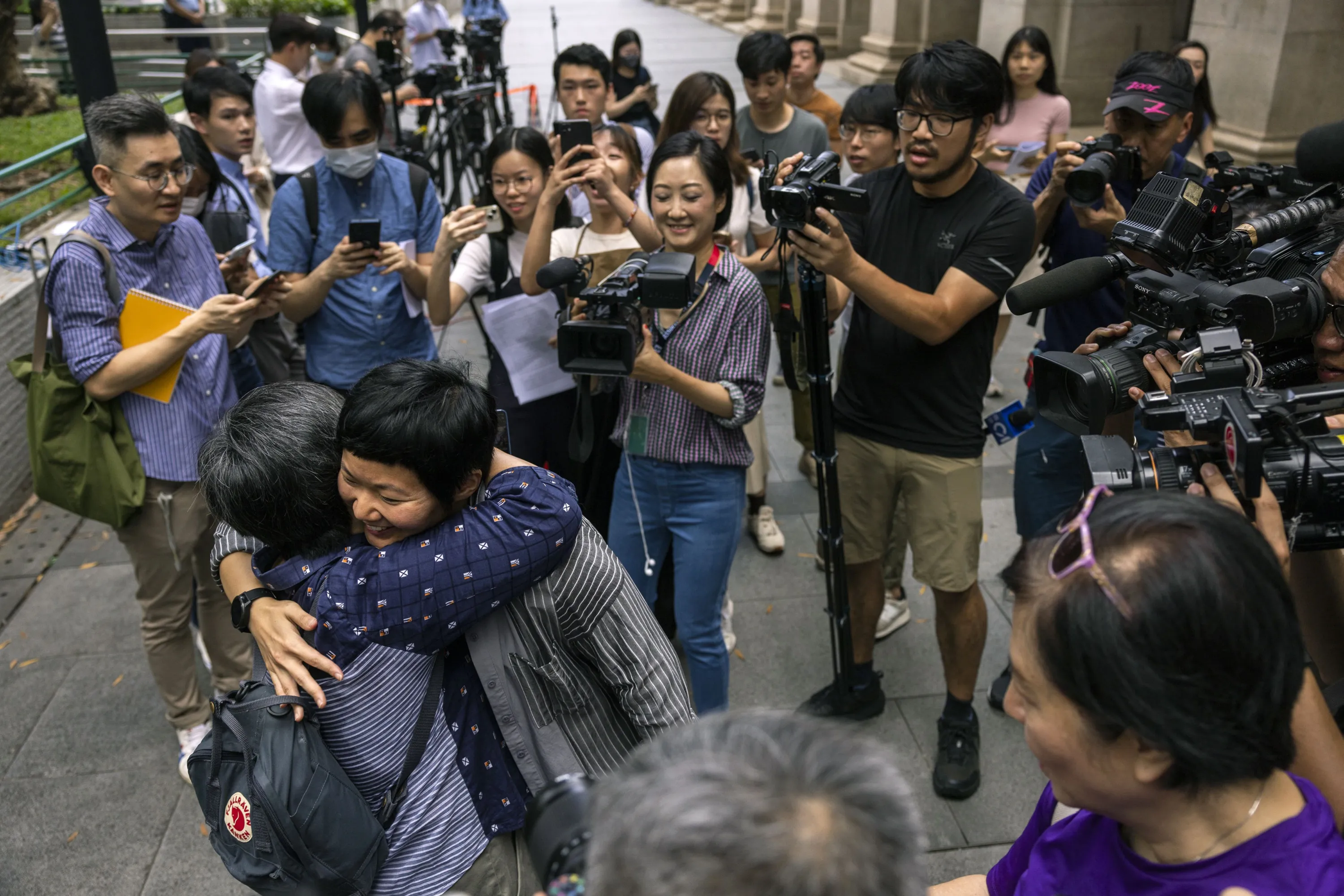 Convicted journalist Bao Choy reacts with supporters after being cleared by top Hong Kong court in Hong Kong, Monday, June 5, 2023. Choy won an appeal quashing her conviction related to work on her investigative documentary Monday in a rare court ruling upholding media freedom in the territory. (Photo by Louise Delmotte/AP Photo)