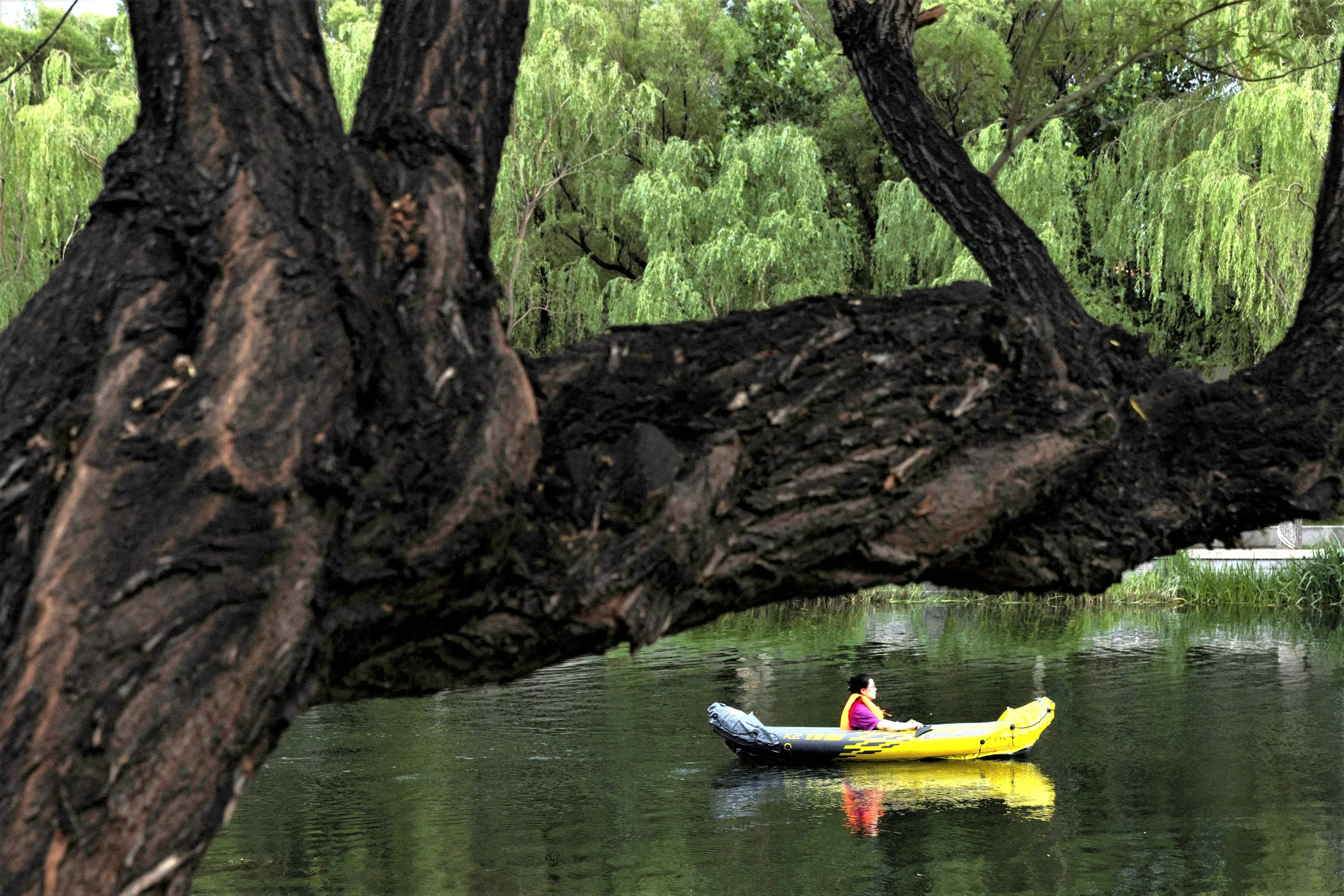 A woman sits in an inflatable boat on a canal to cool off on a hot day in Beijing, China on June 7, 2023. (Photo by Thomas Peter/Reuters)