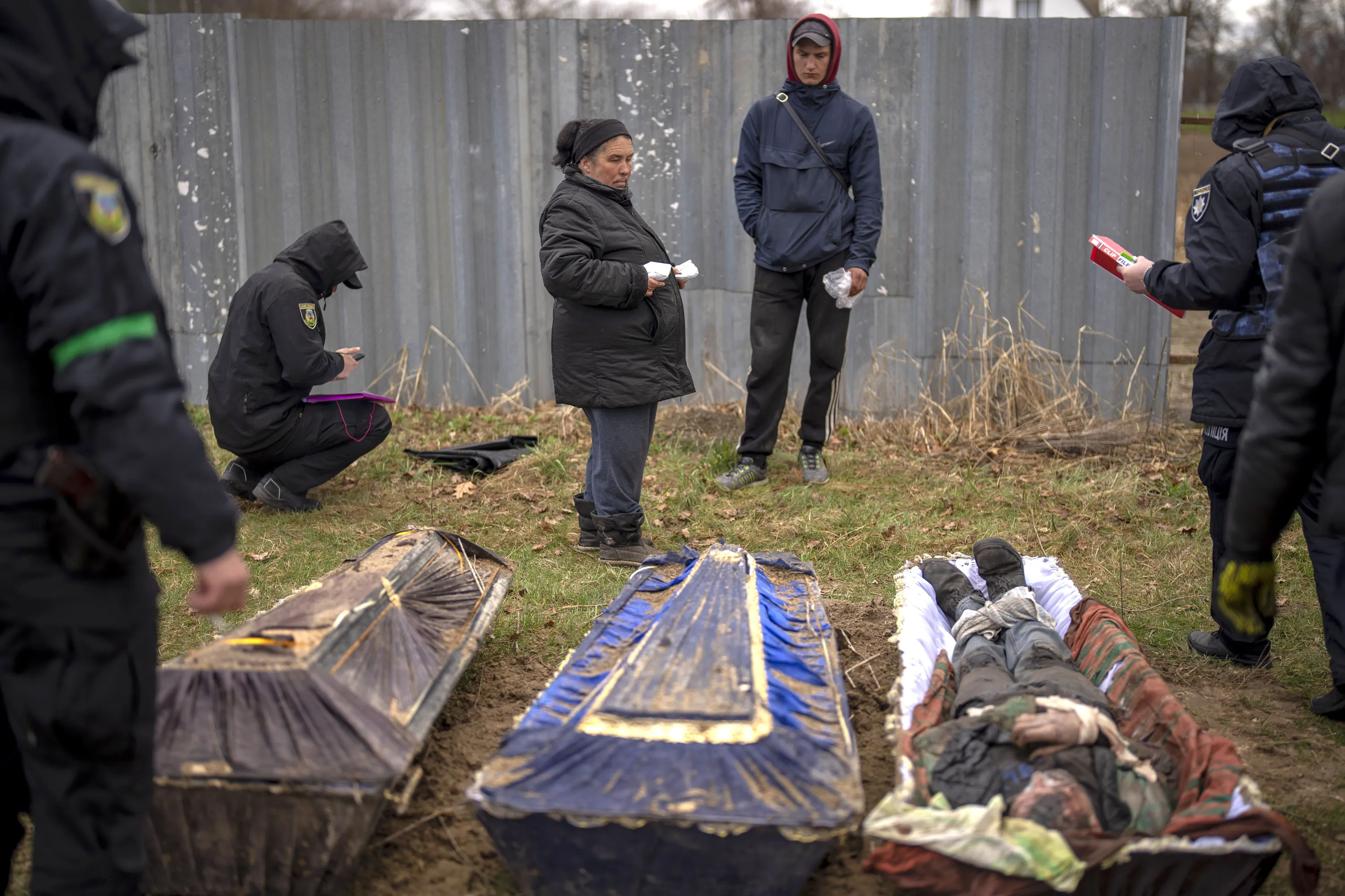 Valya Naumenko, 47, identifies the body of her husband Pavlo Ivanyuk, 57, killed by Russian Army, during an exhumation of four civilians killed and buried in a mass grave in Mykulychi, Ukraine on Sunday, April 17, 2022. All four bodies in the village grave were killed on the same street, on the same day. Their temporary caskets were together in a grave. On Sunday, two weeks after the soldiers disappeared, volunteers dug them up one by one to be taken to a morgue for investigation. (Photo by Emilio Morenatti/AP Photo)