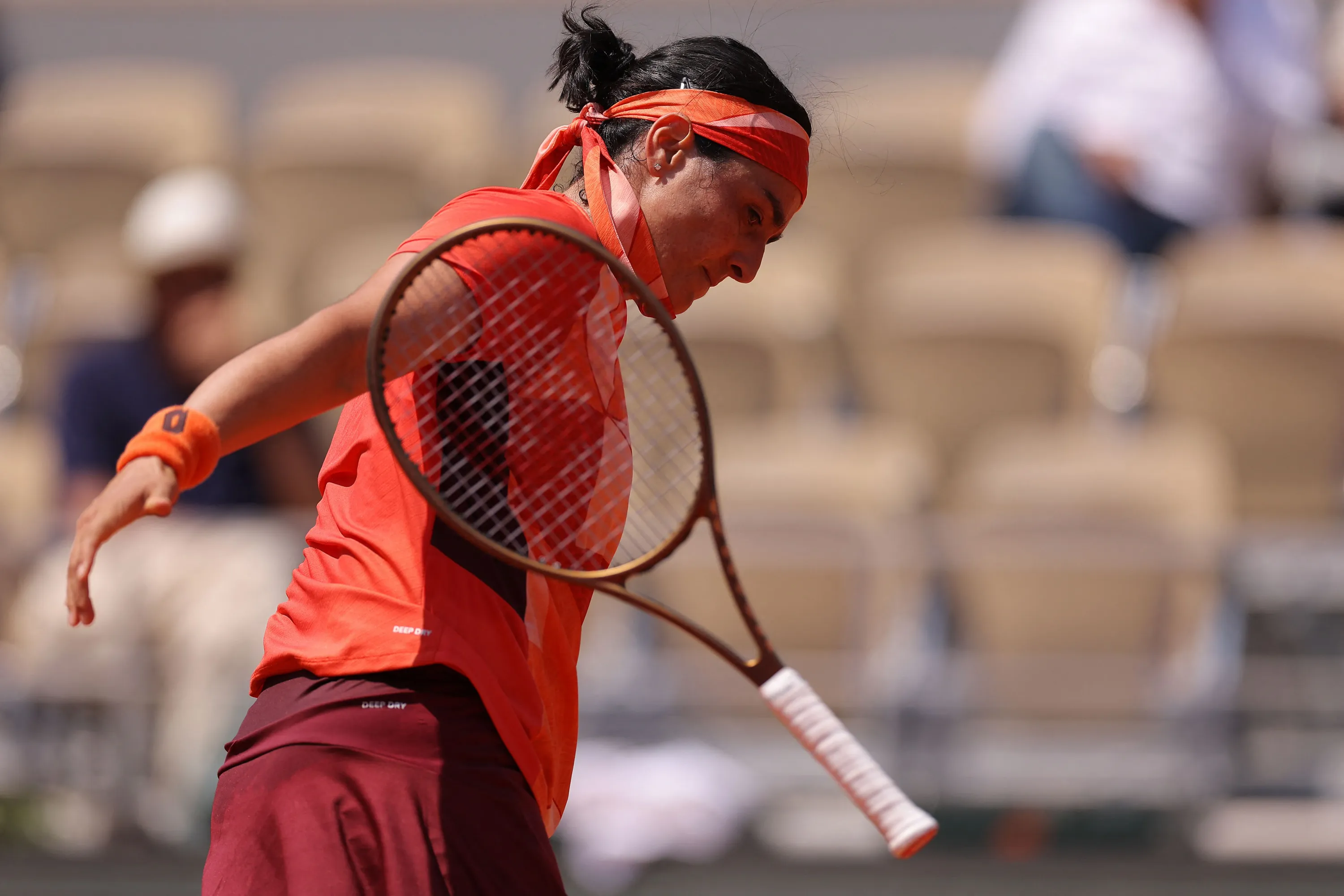 Tunisia's Ons Jabeur throws his racket on the ground after loosing a point against Brazil's Beatriz Haddad Maia during their women's singles quarter final match on day eleven of the Roland-Garros Open tennis tournament at the Court Philippe-Chatrier in Paris on June 7, 2023. (Photo by Thomas Samson/AFP Photo)