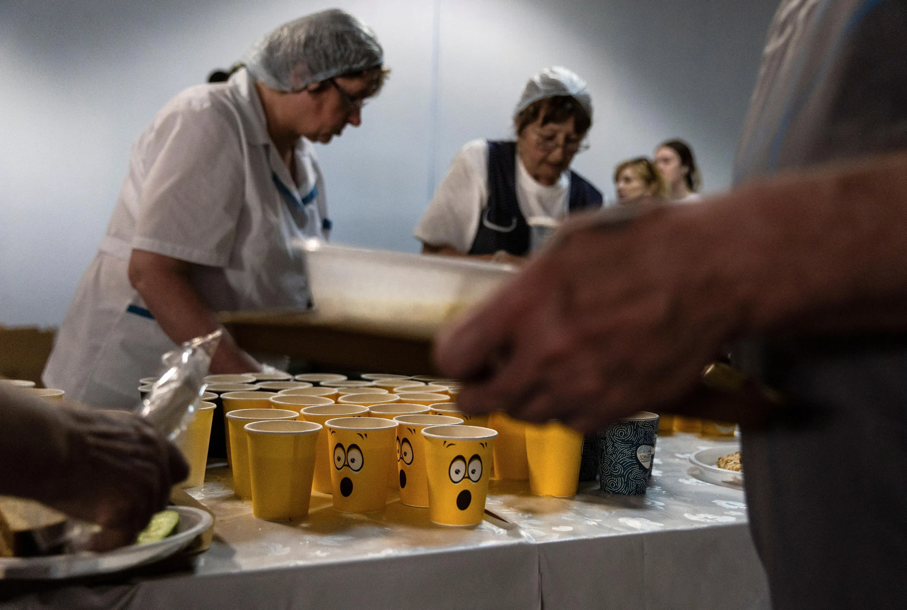 Residents of the Shebekinsky district of Russia's Belgorod region, who were evacuated following recent attacks on settlements near the Russia-Ukraine border in the course of a military conflict, queue to receive their meals at a temporary accommodation centre located in a sports facility in the city of Belgorod, Russia on June 7, 2023. (Photo by Maxim Shemetov/Reuters)