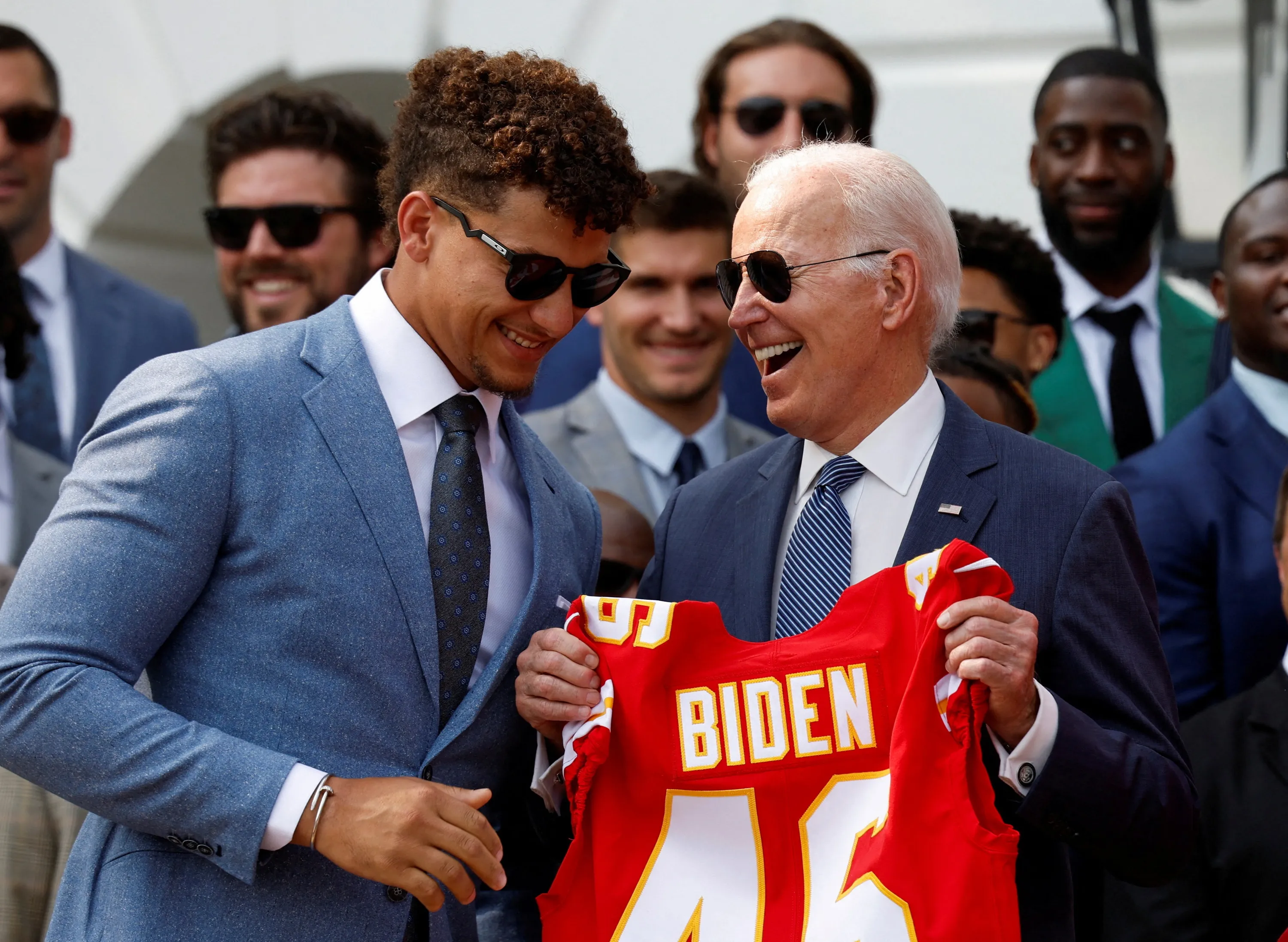 U.S. President Joe Biden reacts as Quarterback Patrick Mahomes and Tight End Travis Kelce present him with a personalized jersey of the Kansas City Chiefs during the team's visit to the White House to celebrate their championship season and victory in Super Bowl LVII, in Washington, U.S., June 5, 2023. (Photo by Evelyn Hockstein/Reuters)