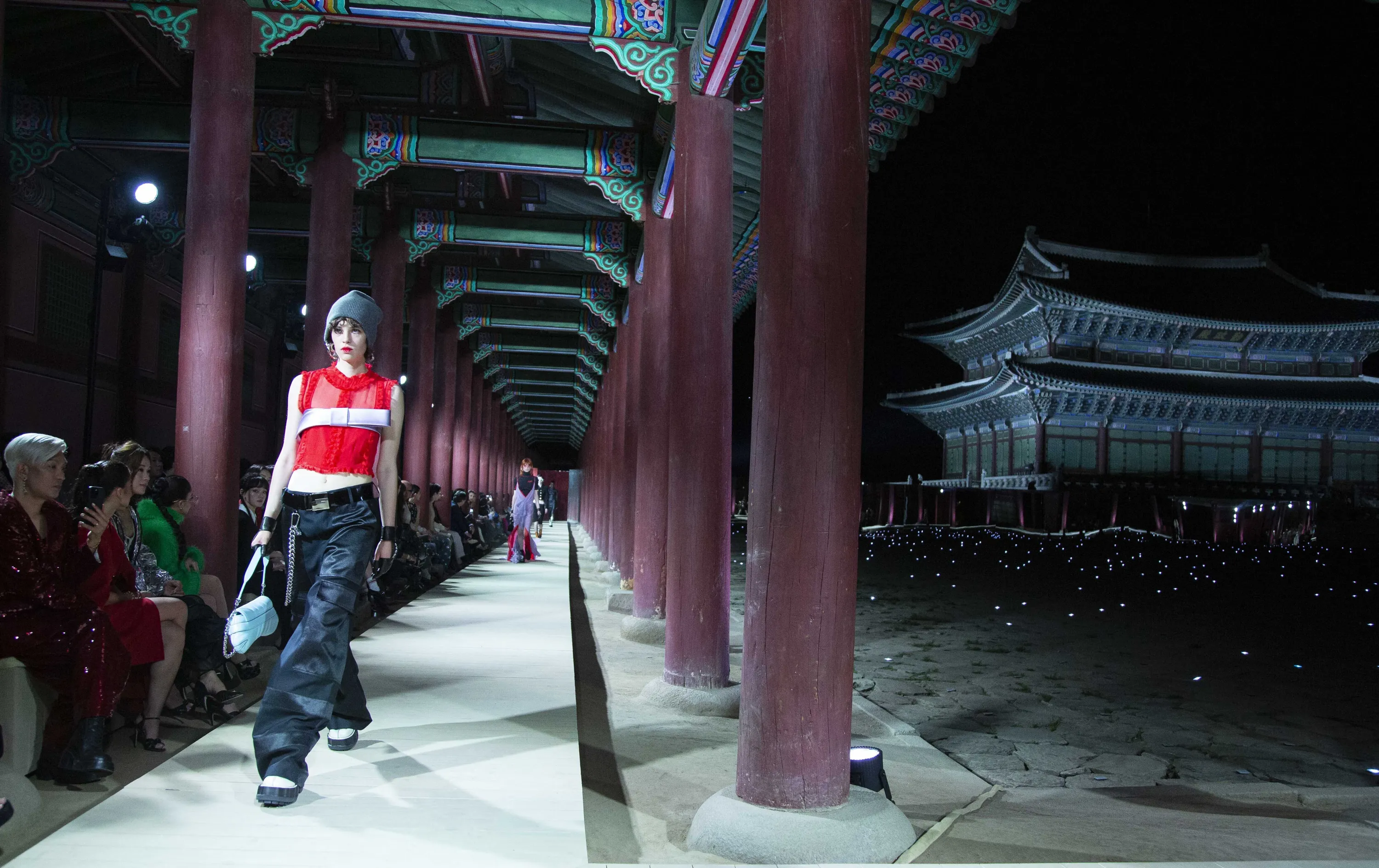 A model presents a creation by Italian brand Gucci during the Gucci 2024 Cruise Collection Fashion Show at Gyeongbokgung Palace in Seoul, South Korea, Tuesday May 16, 2023. (Photo by Jeon Heon-Kyun/Pool via AP Photo)