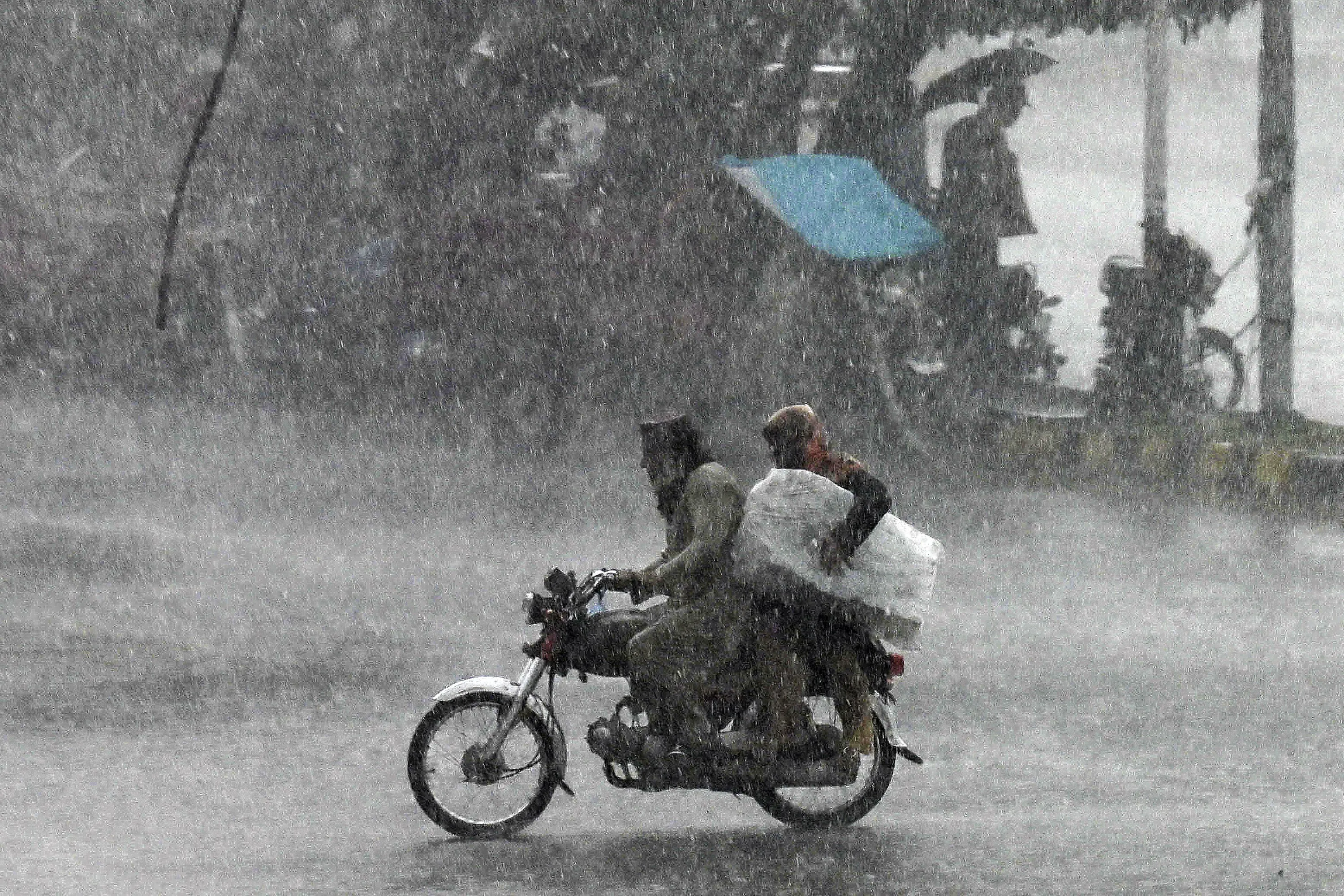 Motorcyclists ride a motorbike along a street during a rainfall in Lahore on June 6, 2023. (Photo by Arif Ali/AFP Photo)