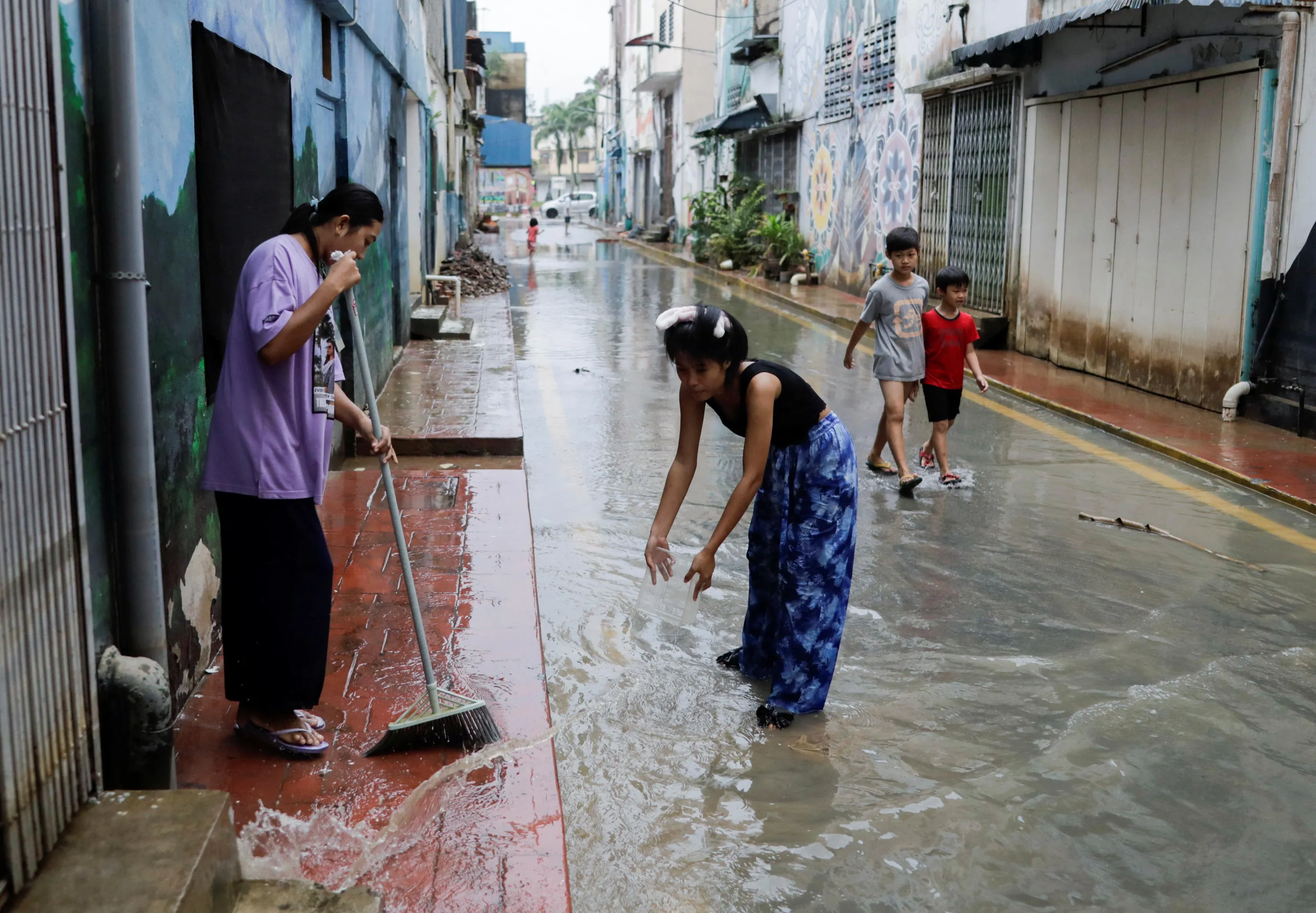 People clean the back-alley of shophouse as the floodwaters recede, in Kota Tinggi, Johor, Malaysia on March 5, 2023. (Photo by Hasnoor Hussain/Reuters)