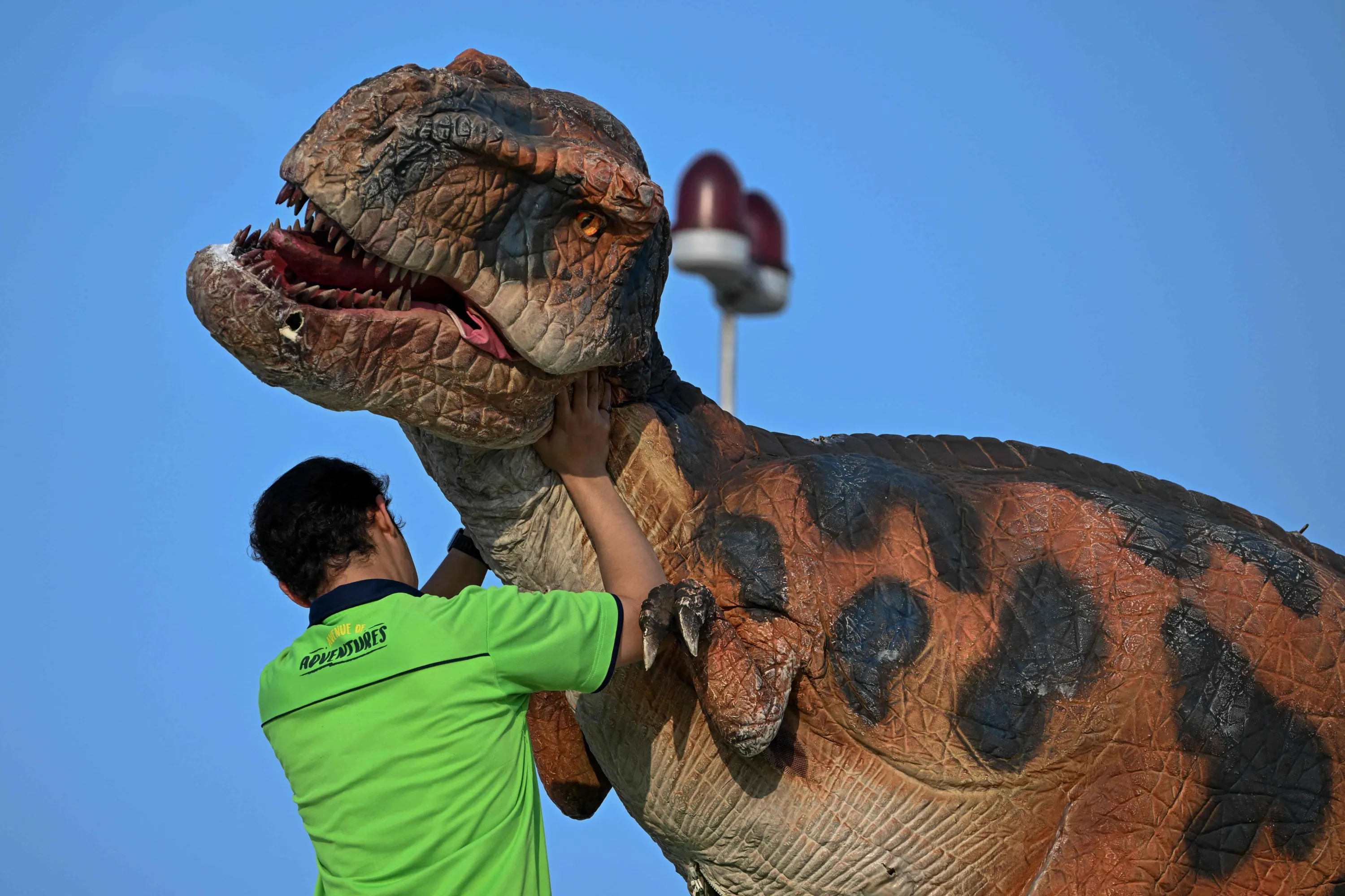 A worker adjusts a performer's dinosaur costume on the top of Penang state's landmark Komtar tower on Penang island in Malaysia on March 10, 2023. (Photo by Mohd Rasfan/AFP Photo)