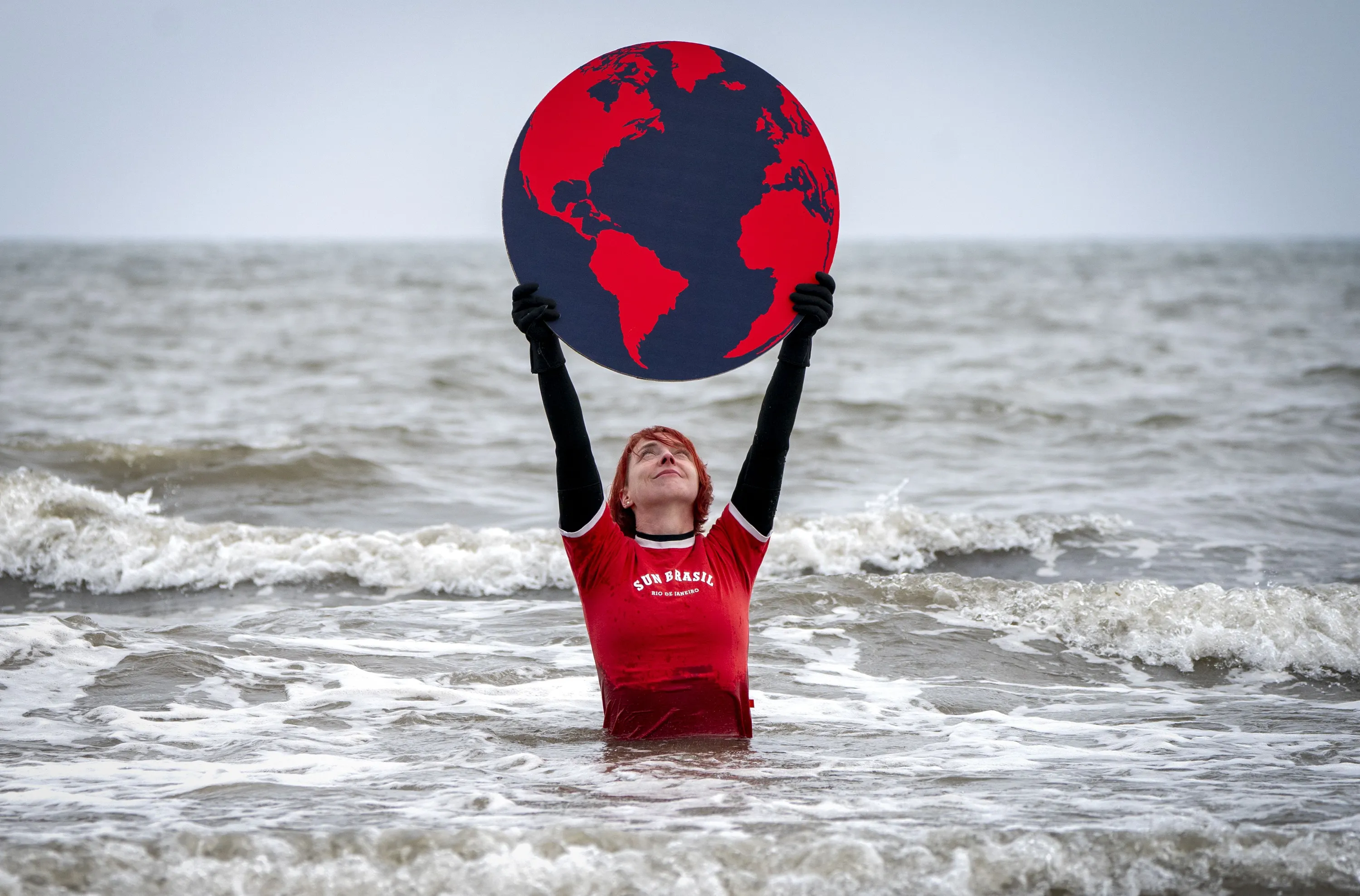 Susie Gray, from the Edinburgh Science Festival team, stands in the Firth of Forth at Portobello in Edinburgh on April 21, 2022, holding a giant black and red Earth to highlight the climate emergency and rising sea levels ahead of Earth Day on Friday April 22, 2022. (Photo by Jane Barlow/PA Images via Getty Images)