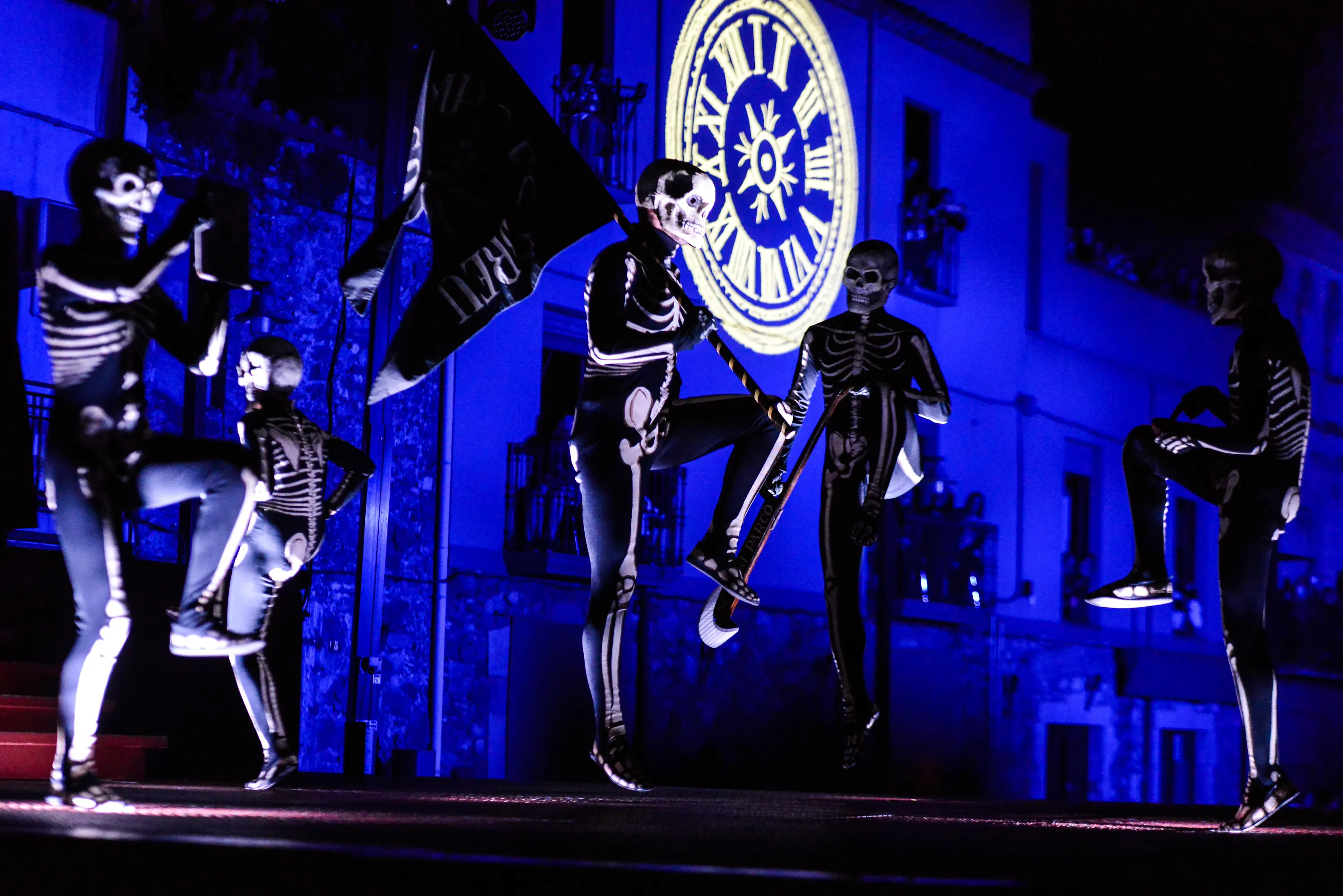 Participants in the events of Maundy Thursday, April 14, 2022, in Verges, Girona, Catalonia, Spain. The “Dança de la Mort” is part of the Maundy Thursday events in the Catalan town. It integrates ten characteristic characters dressed as skeletons inside the procession that dance placed in cross to the sound of a drum. (Photo By Gloria Sanchez/Europa Press via Getty Images)