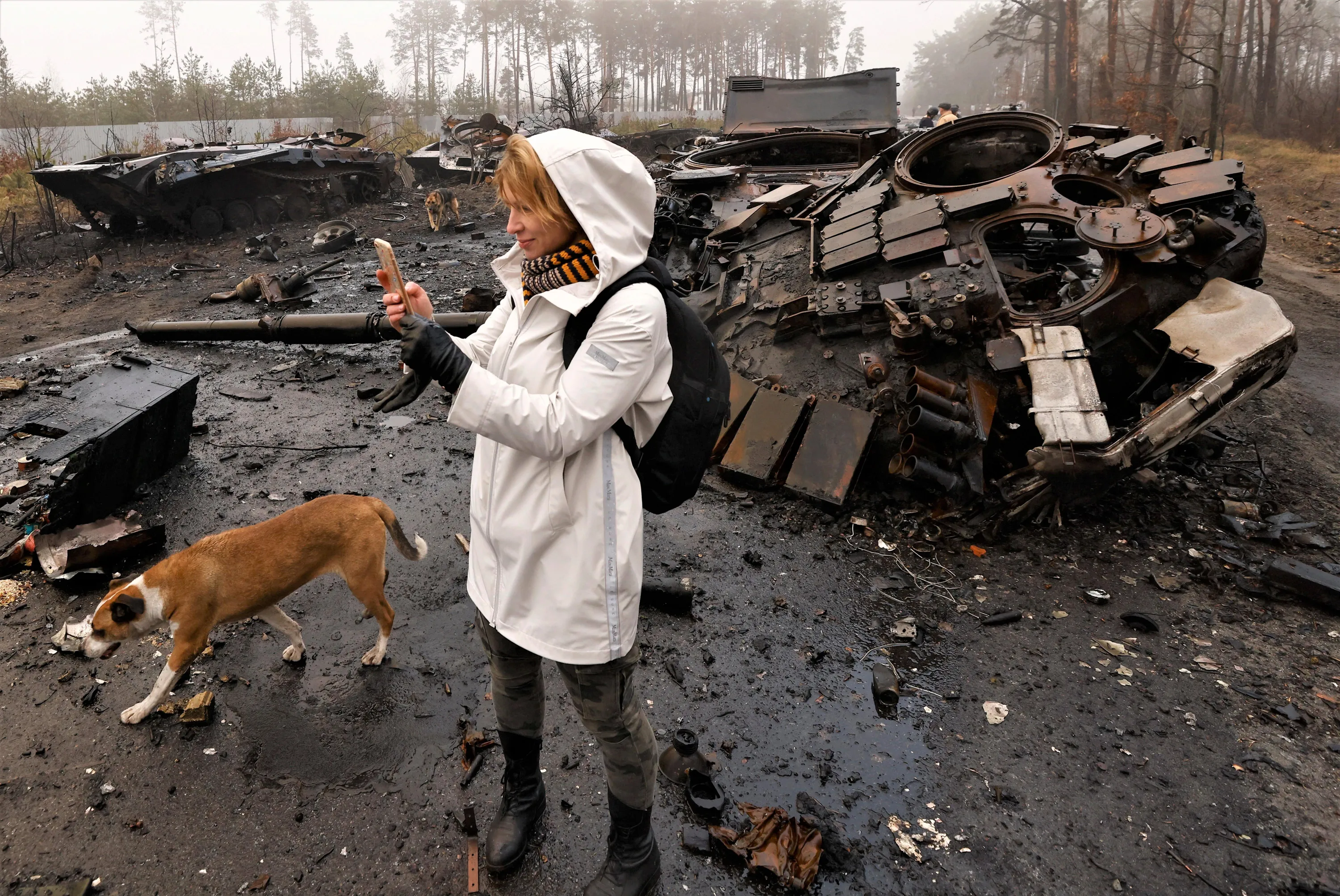Iryna Vereshchagina, films with her mobile phone Russian destroyed tanks and armoured vehicles, amid Russia's invasion of Ukraine, in Dmytrivka village, west of Kyiv, Ukraine April 1, 2022. (Photo by Zohra Bensemra/Reuters)