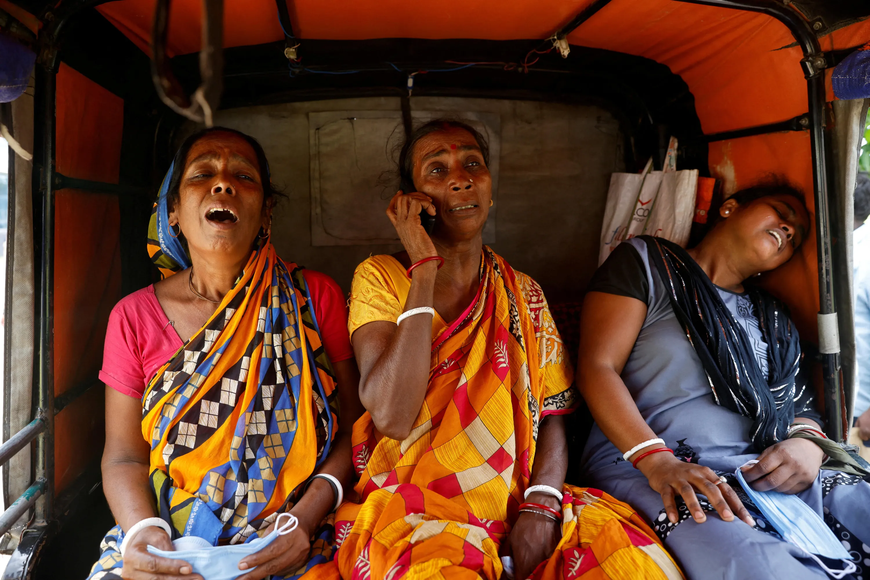 Relatives of train collision victims react as they sit in an autorickshaw outside a temporary mortuary created in a business park, following the train collision in Balasore district in the eastern state of Odisha, India on June 4, 2023. (Photo by Adnan Abidi/Reuters)